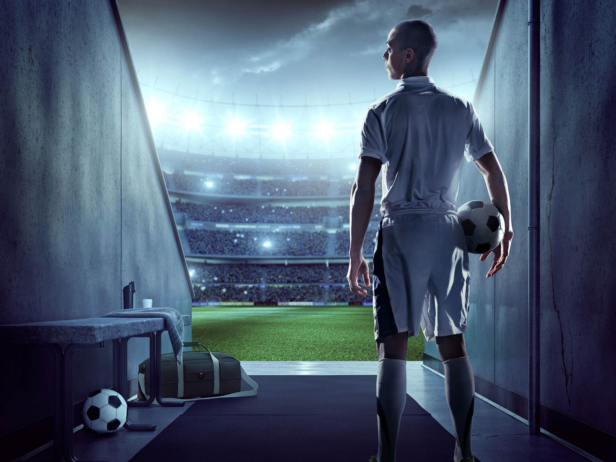 Football player in the stadium. An imaginary stadium is modelled and rendered.