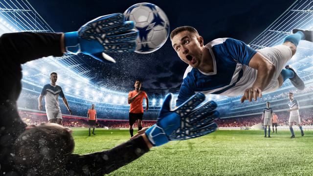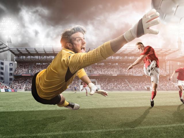 soccer_96A football goalkeeper diving and saving a shot that is going in the top corner. A football goalkeeper in sleek athletic wear dives horizontally, gloves outstretched, saving a shot in mid-air, Dramatic stadium lighting enhances the dynamic movement and