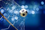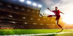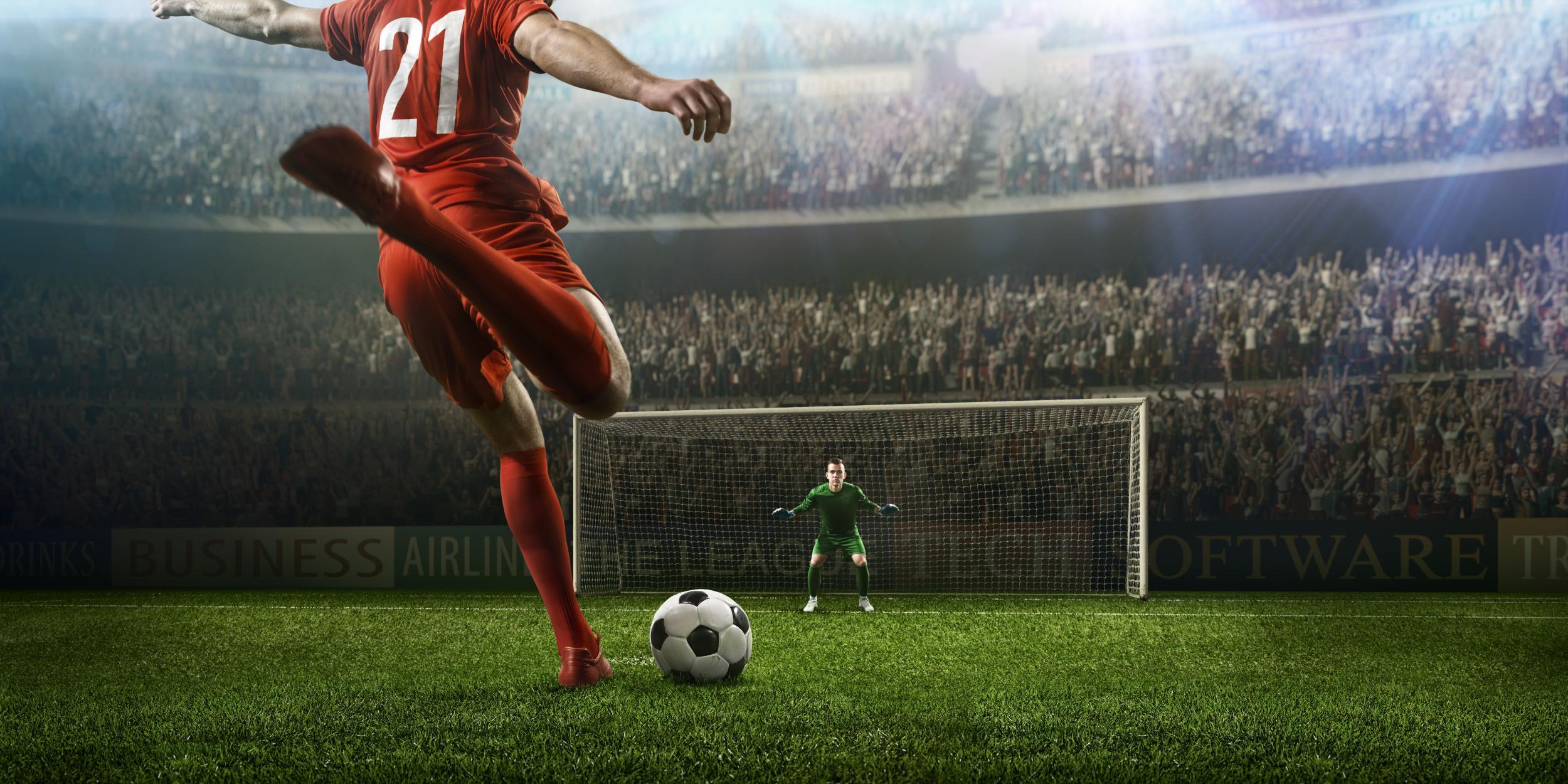 Soccer player kicks the ball in the stadium. Goalkeeper tries to catch the ball