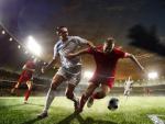 soccer_90Two soccer players in action fighting for a ball. Soccer stadium with tribunes, illuminations and spectators.
