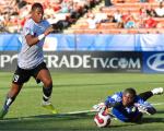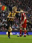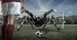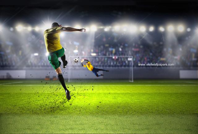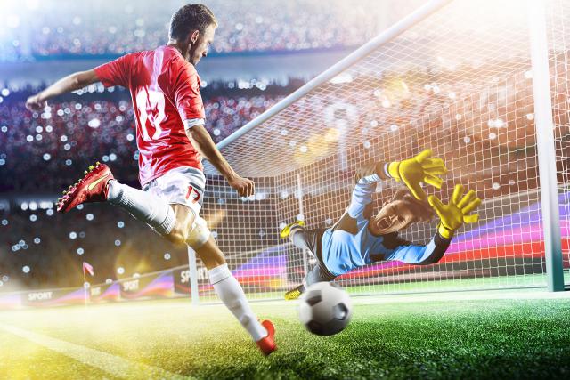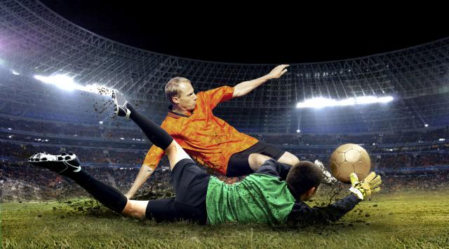 soccer_80Soccer player kicks the ball in the stadium. Goalkeeper tries to catch the ball