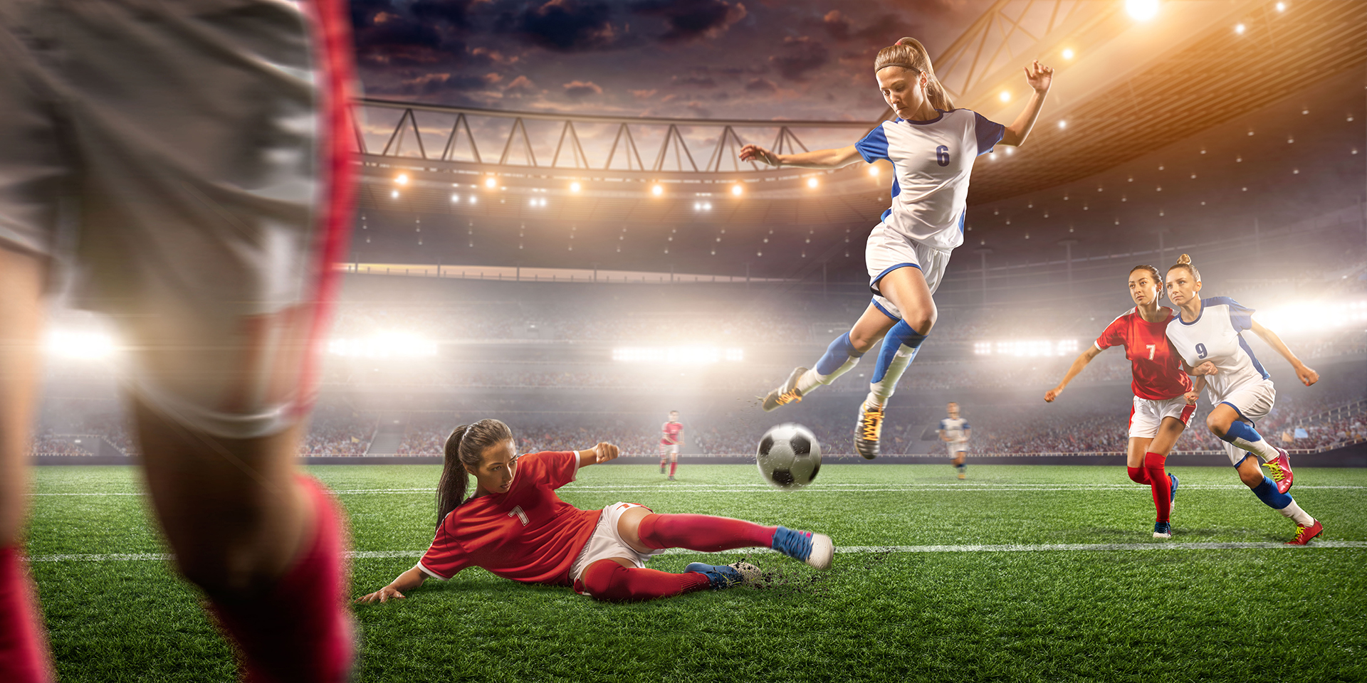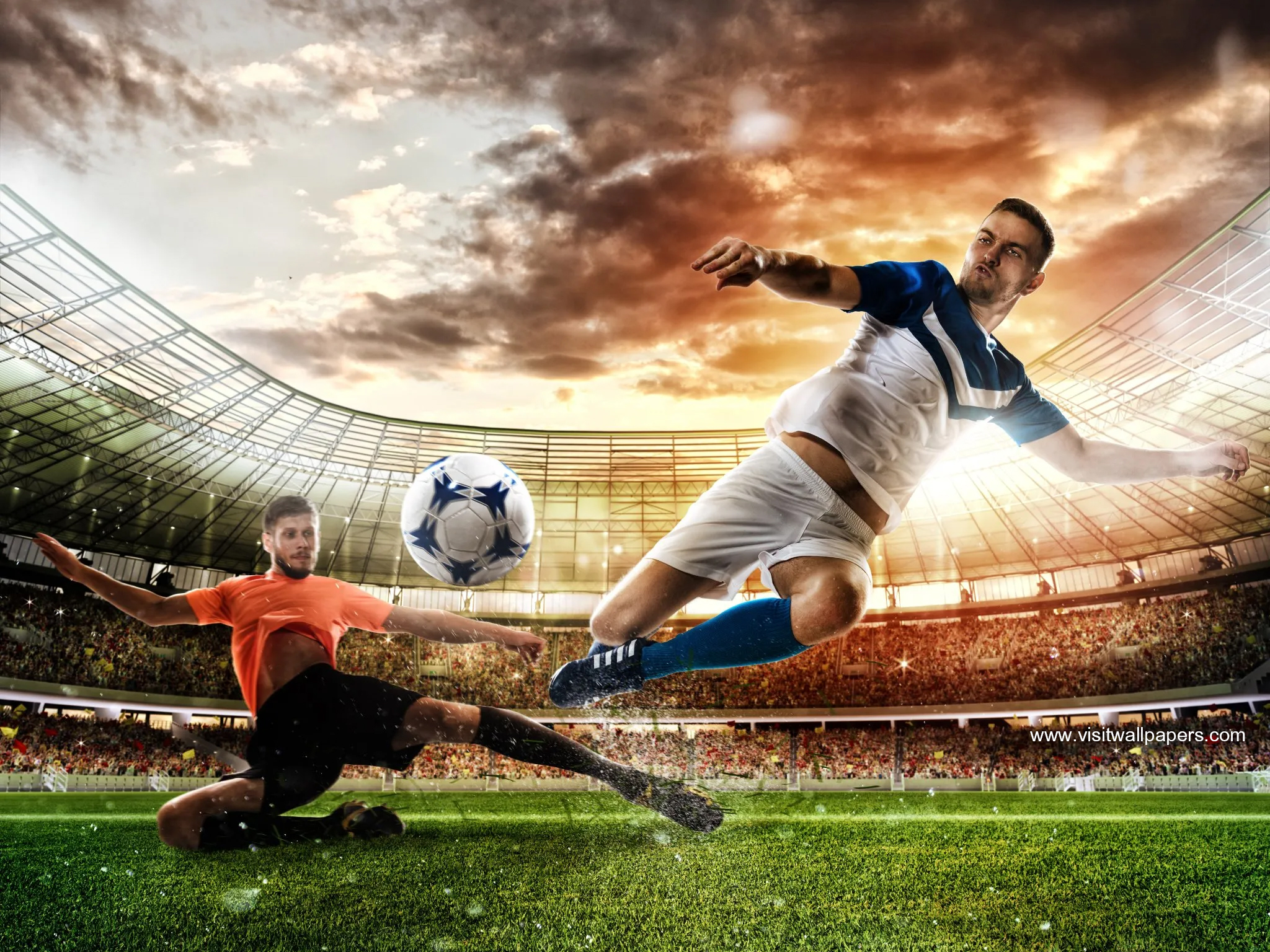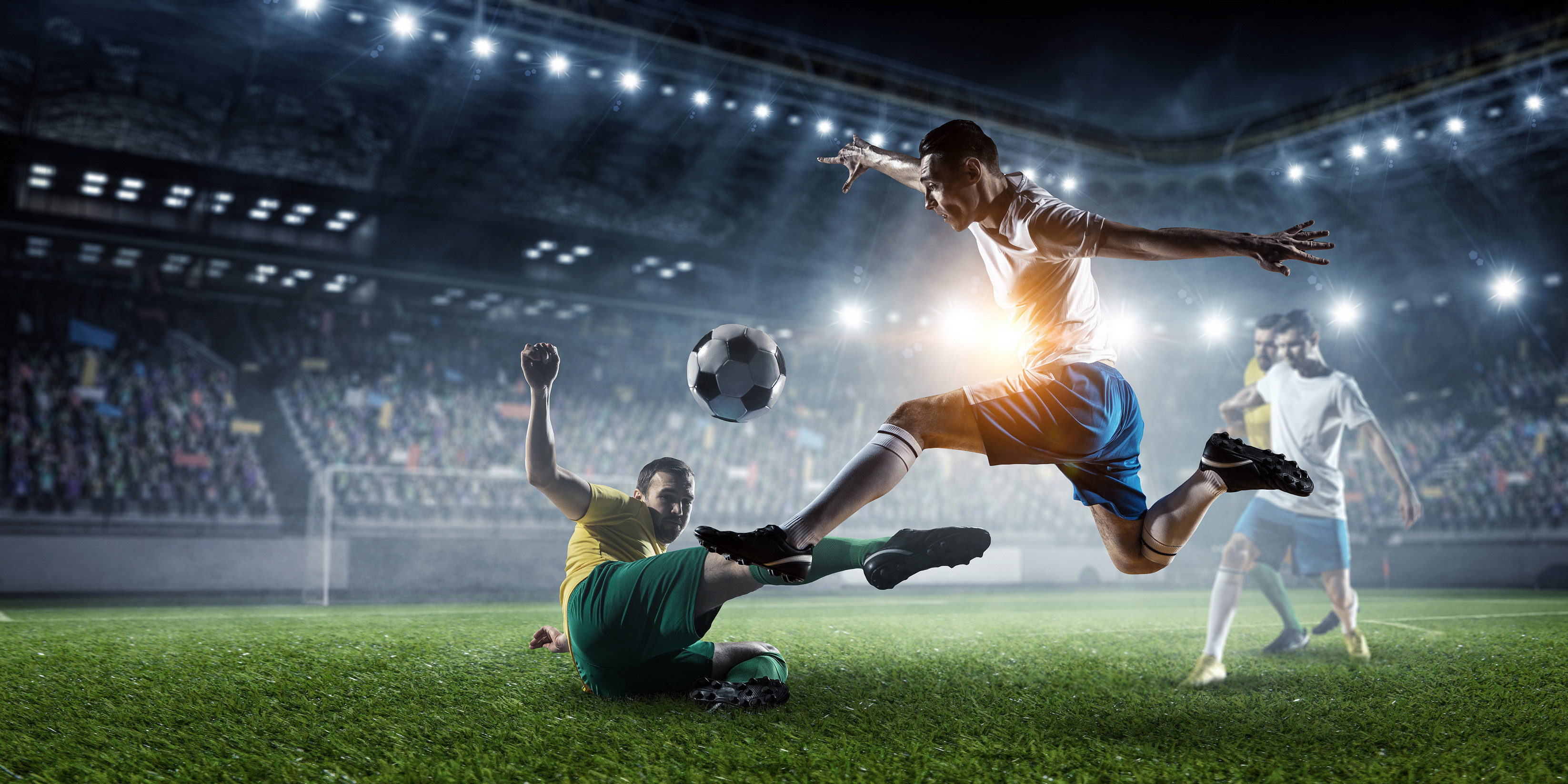 soccer_69Three soccer players fight for a ball. Tough competition. Slide tackle. Soccer stadium (3D render)