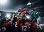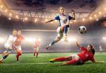 soccer_62Three soccer players on a professional stadium fight for ball. Soccer stadium with tribunes, illuminations and spectators