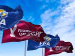 DOHA, QATAR, : Flags of all 32 teams participating on FIFA World Cup Qater 2022. Official Logo of Soccer tournament on red background