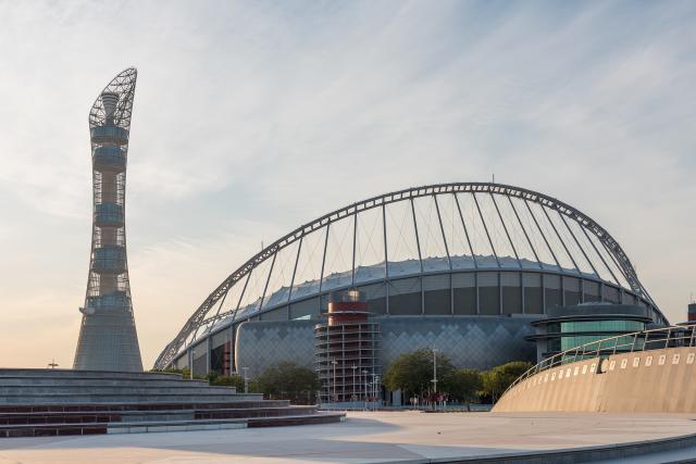 worldcup_2022_53DOHA, QATAR : View of the Education City Stadium, located in the universities campus zone in Doha, Qatar. FIFA World Cup. Celebration winning trophy with stadium. 3d illustration isolated