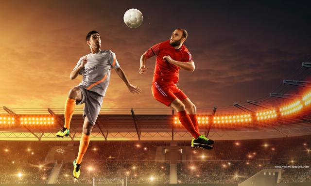 soccer_91Two soccer players in action fighting for a ball. Soccer stadium with tribunes, illuminations and spectators.