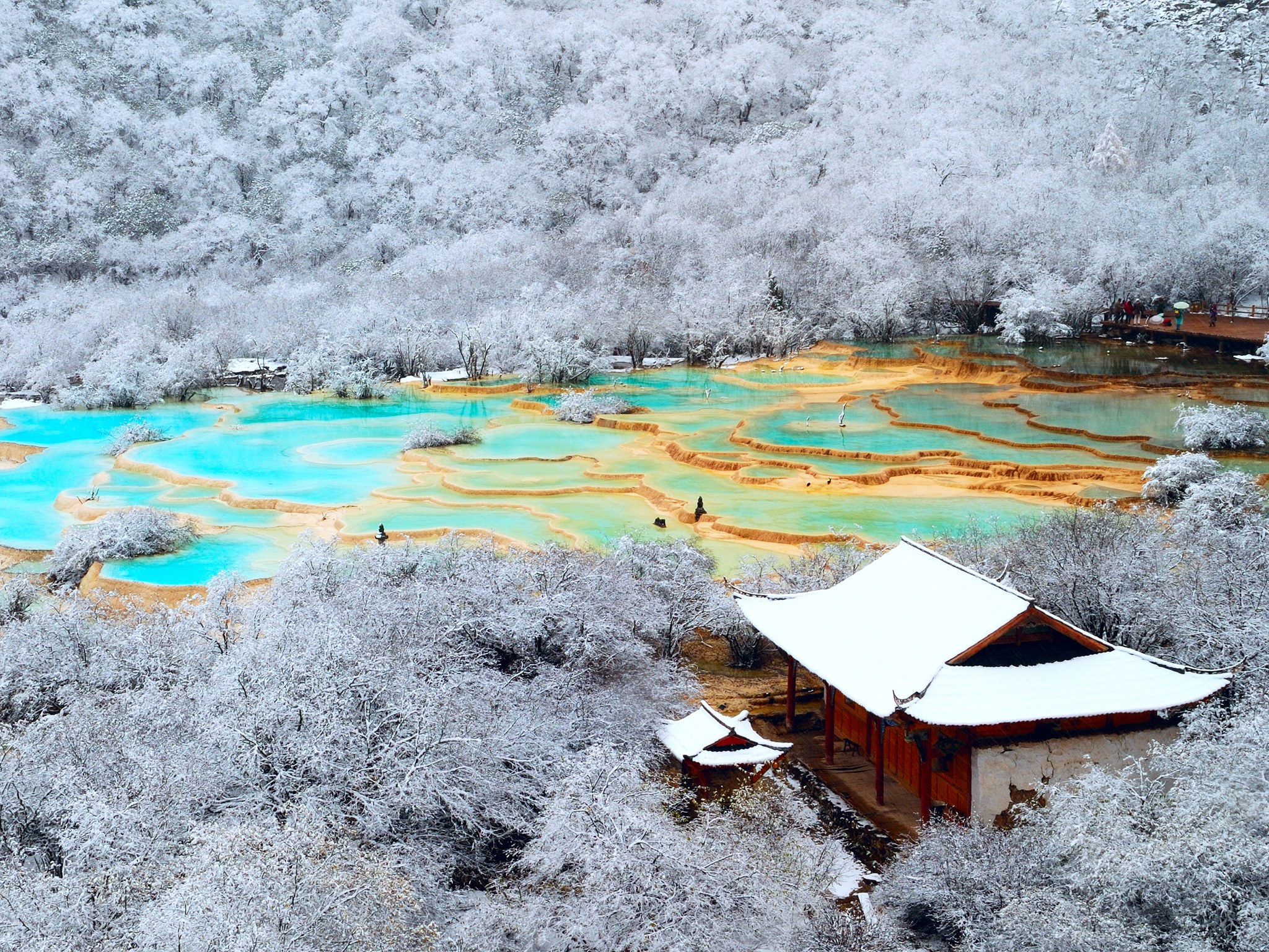 china_945 Huanglong (simplified Chinese: 黄龙; traditional Chinese: 黃龍; pinyin: Huánglóng; lit. 'yellow dragon') is a scenic and historic interest area in the northwest part of Sichuan, China. It is located in the southern part of the Minshan mountain range, 370 ki Date: 5/10/2023 Huanglong (simplified Chinese: 黄龙; traditional Chinese: 黃龍; pinyin: Huánglóng; lit. 'yellow dragon') is a scenic and historic interest area in the northwest part of Sichuan, China. It is located in the southern part of the Minshan mountain range, 370 kilometres (230 mi) north-northwest of the capital Chengdu.[1] This area is known for its colorful travertine pools formed by calcite deposits, especially in Huanglonggou (Yellow Dragon Gully), as well as diverse forest ecosystems, snow-capped peaks, waterfalls and hot springs. Huanglong is also home to many endangered species including the giant panda and the Sichuan golden snub-nosed monkey.[1] In addition, a large population of the endemic orchid species 'Cypripedium plectrochilum' was discovered at the site [2] Huanglong was declared a World Heritage Site by UNESCO in 1992 because of its outstanding travertine formations, waterfalls and limestone formations as well as its travertine terraces and lakes rating among the three most outstanding examples in the world.
