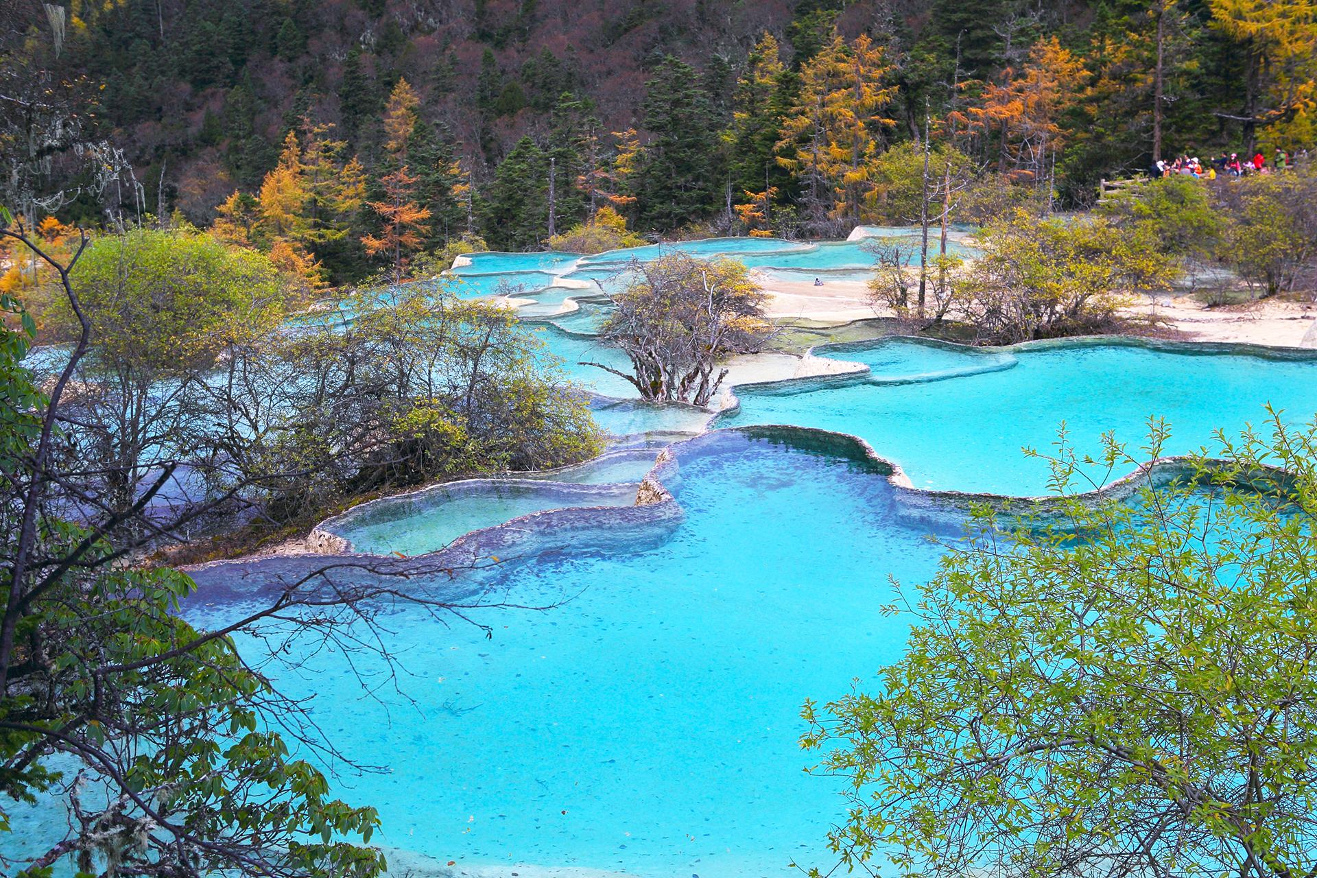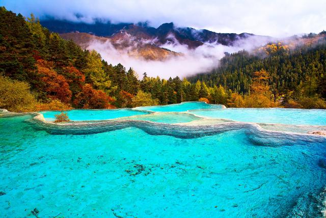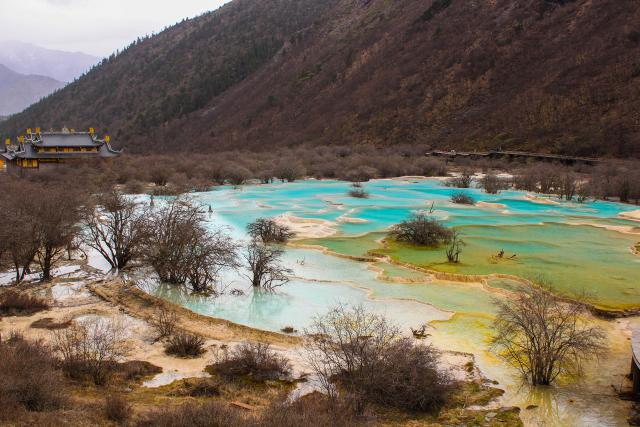 china_919 Beautiful Multi-coloured ponds and mountains view in Huanglong National Park, Sichuan, China Date: 4/18/2022 Beautiful Multi-coloured ponds and mountains view in Huanglong National Park, Sichuan, China