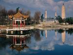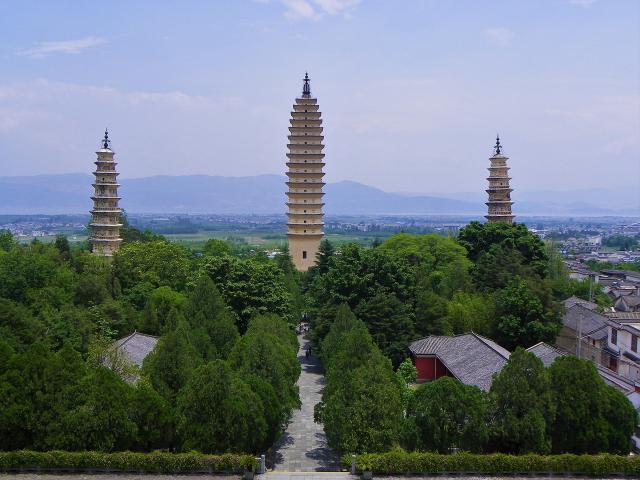 china_940 The Three Pagodas of the Chongsheng Temple (Chinese: 崇圣寺三塔; pinyin: Chóngshèng Sì Sāntǎ) are an ensemble of three independent pagodas arranged on the corners of an equilateral triangle, near the old town of Dali, Yunnan province, China, dating from the ti Date: 2/5/2023 The Three Pagodas of the Chongsheng Temple (Chinese: 崇圣寺三塔; pinyin: Chóngshèng Sì Sāntǎ) are an ensemble of three independent pagodas arranged on the corners of an equilateral triangle, near the old town of Dali, Yunnan province, China, dating from the time of the Kingdom of Nanzhao and Kingdom of Dali in the 9th and 10th centuries.