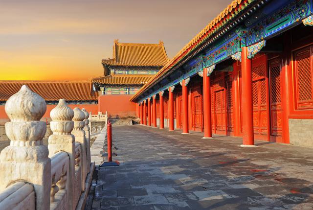 china_985 The forbidden city with sunset glow in beijing, China Date: 11/19/2023 The forbidden city with sunset glow in beijing, China