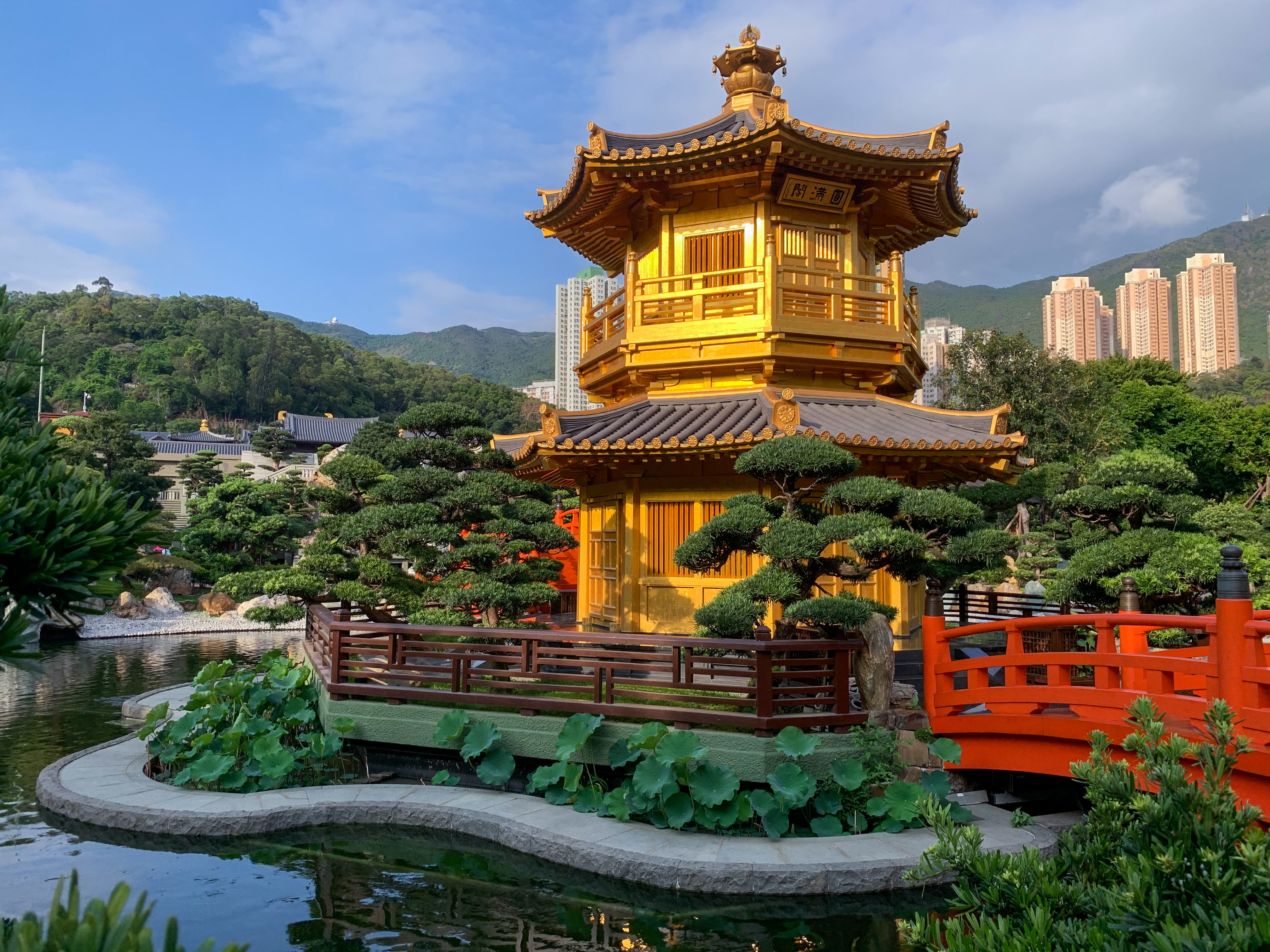 Hong_Kong_30 Young woman traveler traveling into Hongkong beautiful golden teak wood pagoda at Nan Lian Garden in Hong Kong Date: 9/20/2023 Young woman traveler traveling into Hongkong beautiful golden teak wood pagoda at Nan Lian Garden in Hong Kong