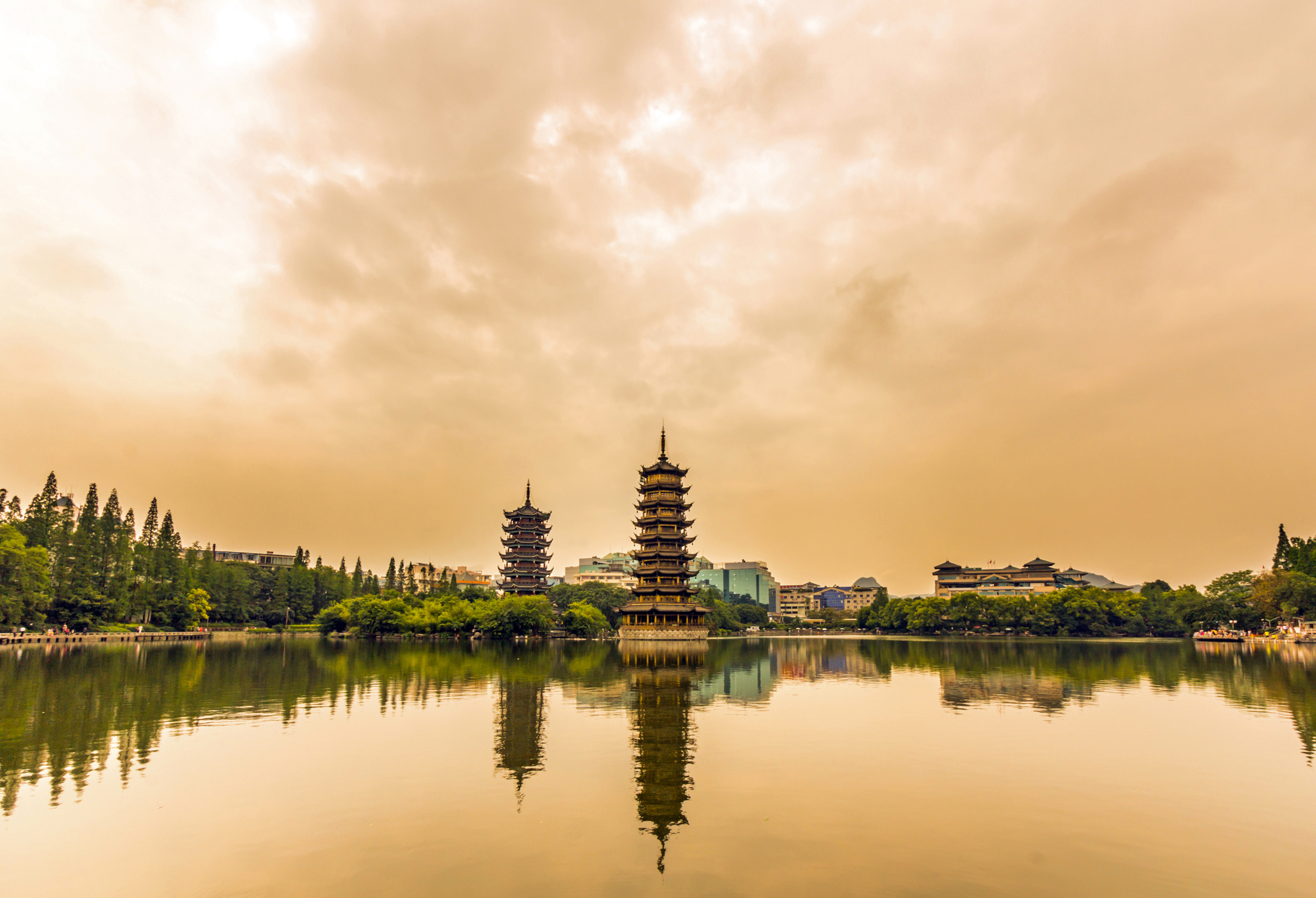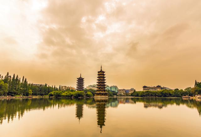 china_970 Sun and Moon Twin Pagodas at dusk in Guilin, China Date: 9/24/2023 Sun and Moon Twin Pagodas at dusk in Guilin, China