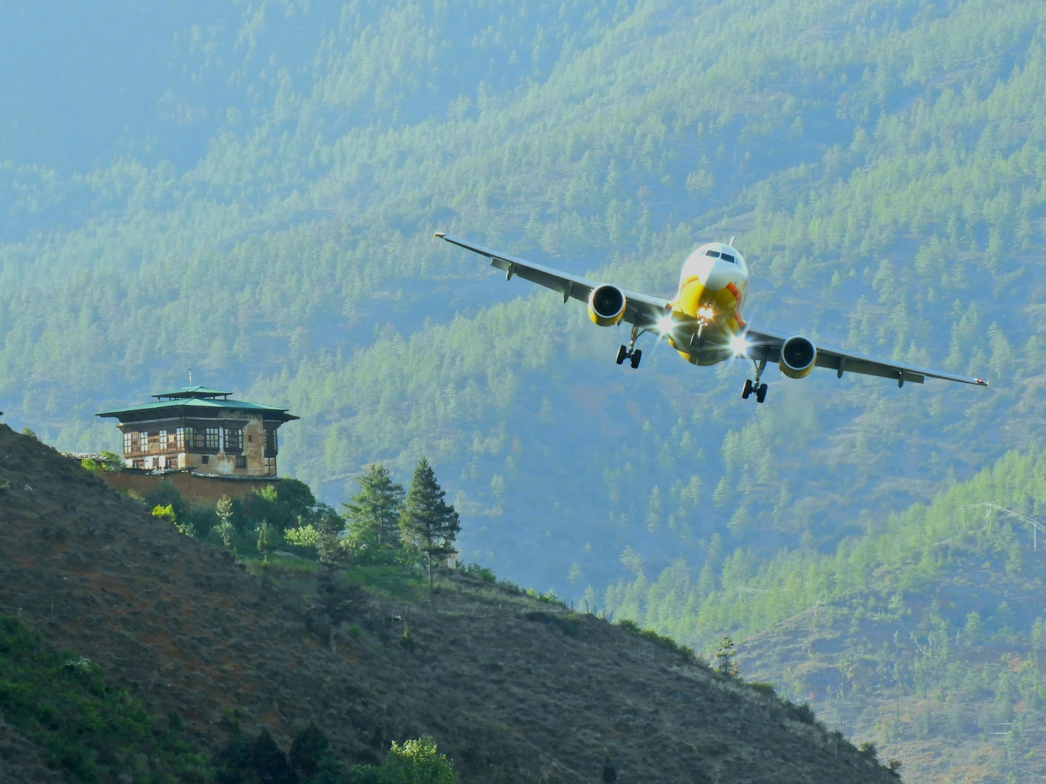 bhutan_18Bhutanese airline flying behind country house in Paro, Bhutan