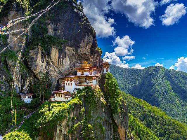Spectacular views of Tiger's Nest Monastery, also known as Paro Taktsang, and surrounding area.