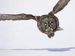 Birds_314Flying Eurasian Eagle owl with open wings with snow flake in snowy forest during cold winter. Action wildlife scene from nature.