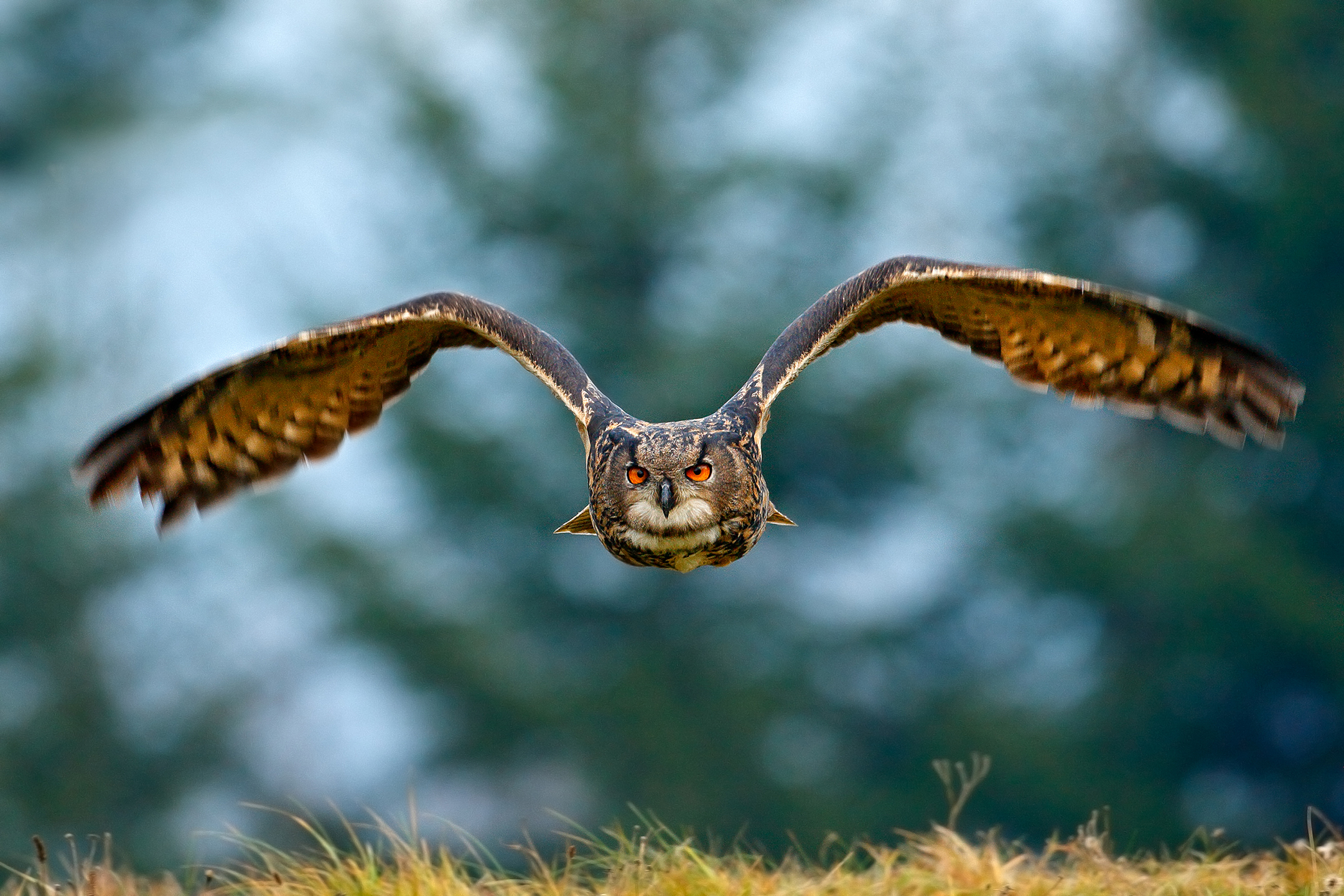 Birds_385Eurasian eagle-owl, Bubo bubo, flying bird with open wings over grassy meadow, forest in the background, animal in the nature habitat, Sweden.