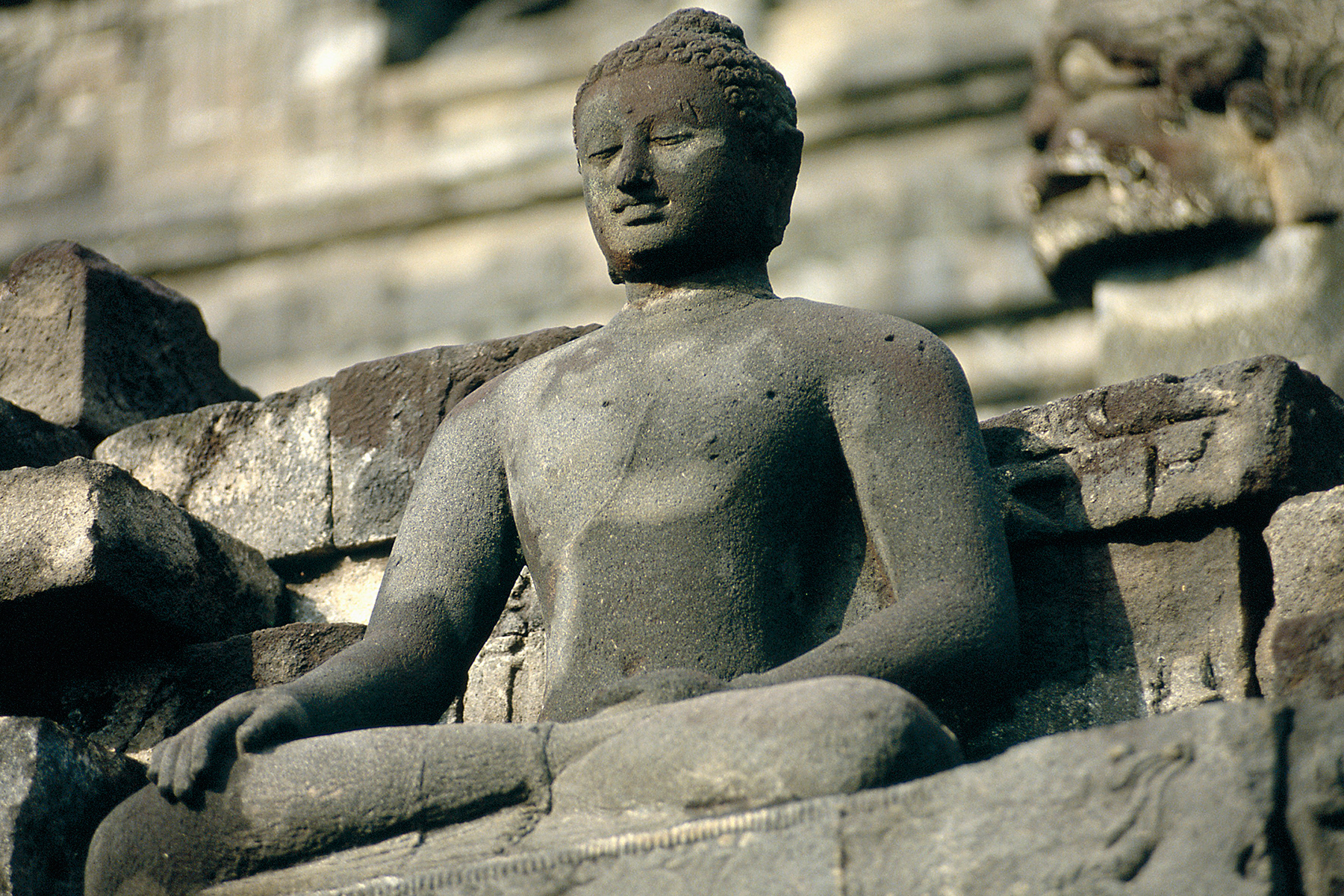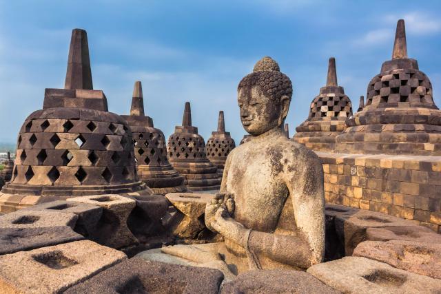 Indonesia_164Amazing view of ancient Borobudur Buddhist temple with meditating Buddha statue carved from dark stone against blue sky on background. Great religious architecture. Magelang, Central Java, Indonesia