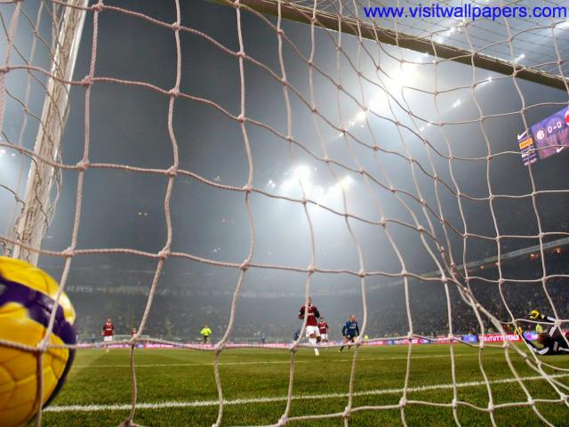soccer_85Soccer ball in goal. Soccer ball flew into the goal. Soccer ball bends the net, against the background of flashes of light. Soccer ball in goal net on blue background. A moment of delight. 3D illustration
