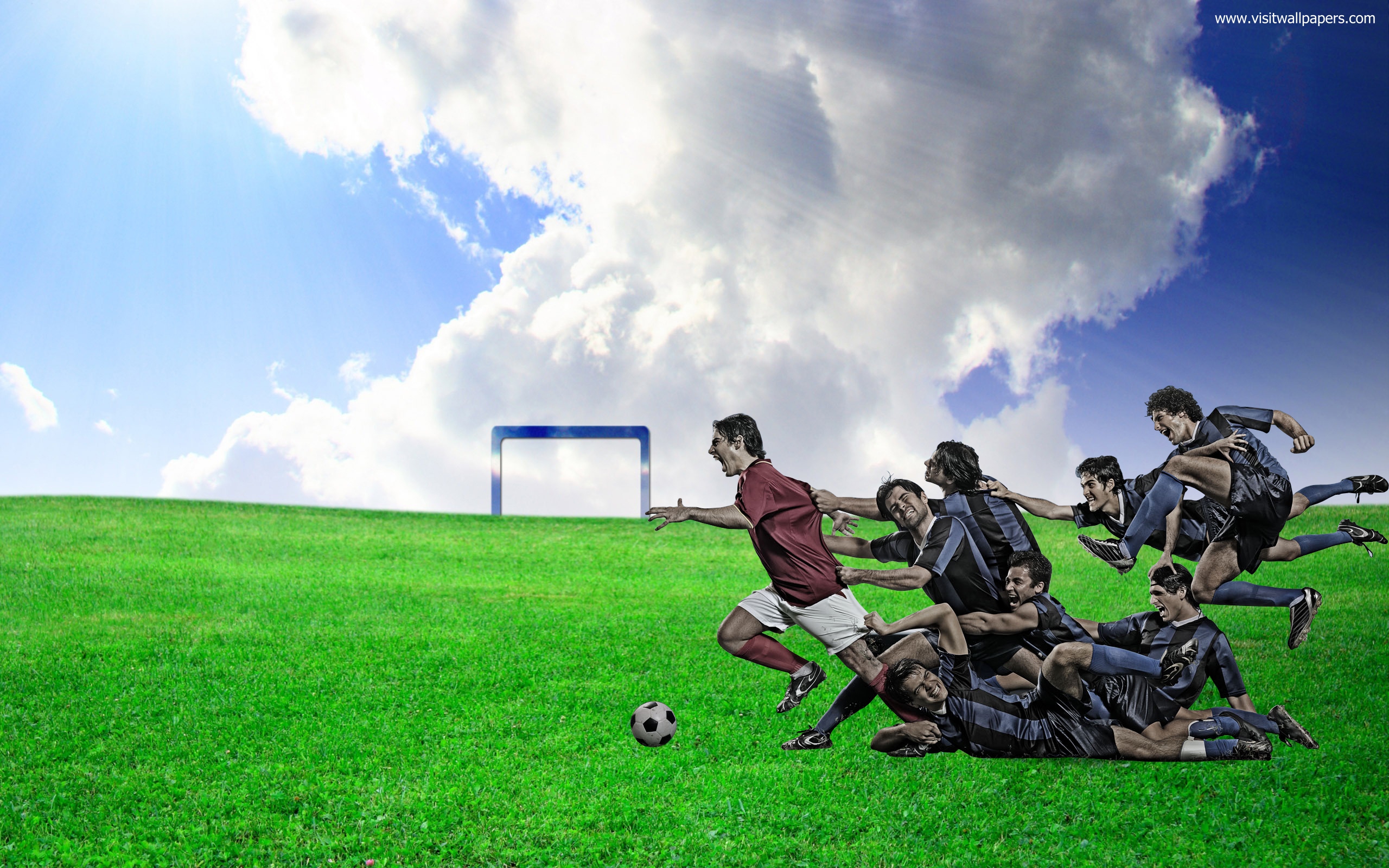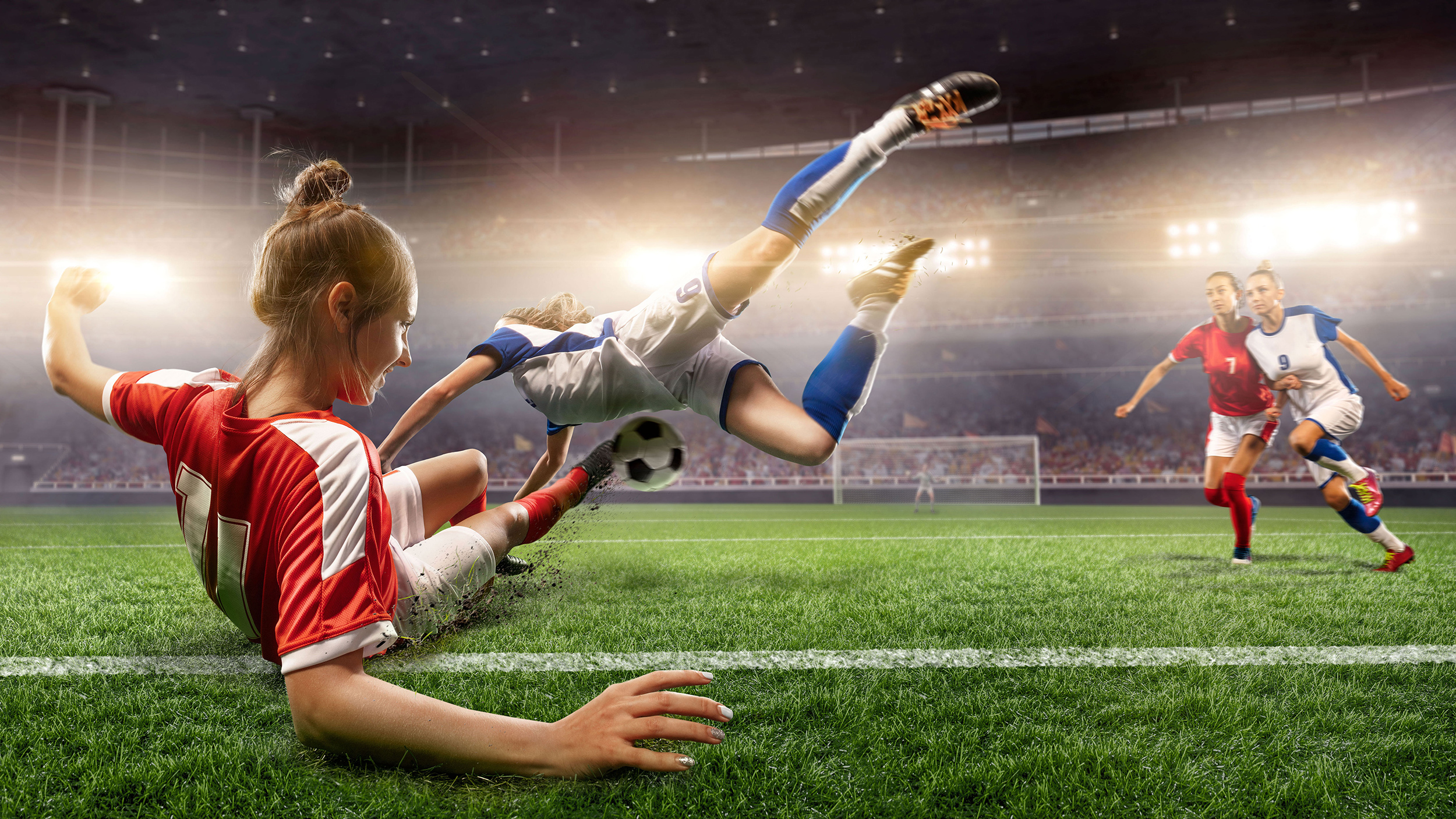 soccer_69Three soccer players fight for a ball. Tough competition. Slide tackle. Soccer stadium (3D render)