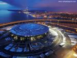 Aerial view from above of the Etihad Stadium, home of Manchester City FC.