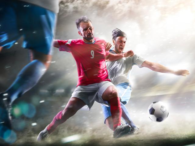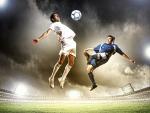 soccer_90Two soccer players in action fighting for a ball. Soccer stadium with tribunes, illuminations and spectators.