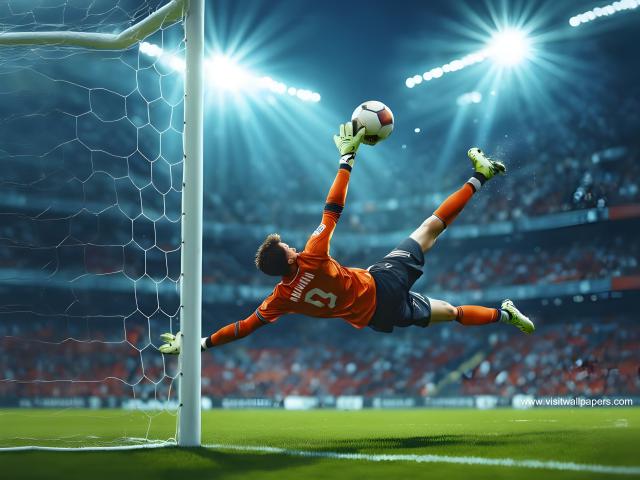 soccer_96A football goalkeeper diving and saving a shot that is going in the top corner. A football goalkeeper in sleek athletic wear dives horizontally, gloves outstretched, saving a shot in mid-air, Dramatic stadium lighting enhances the dynamic movement and