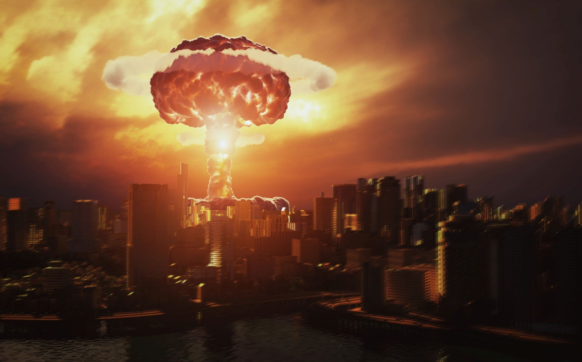 Japan_213 nuclear explosion over the city. 3d rendering concept. The United States dropped the bomb on Hiroshima, a city in southwest Japan, on August 6, 1945, killing more than 70,000 people instantly. A second bomb followed three days later over Nagasaki a Date: 3/14/2022 nuclear explosion over the city. 3d rendering concept