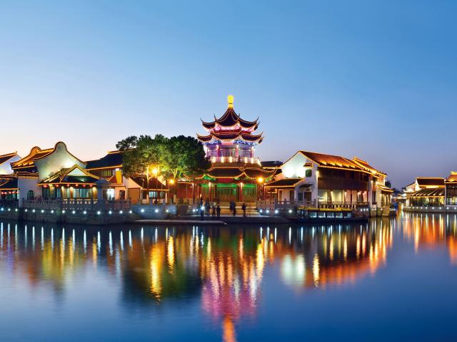 Jixian Pavilion at dusk, West Lake, Hangzhou, China