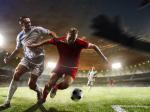 soccer_91Two soccer players in action fighting for a ball. Soccer stadium with tribunes, illuminations and spectators.