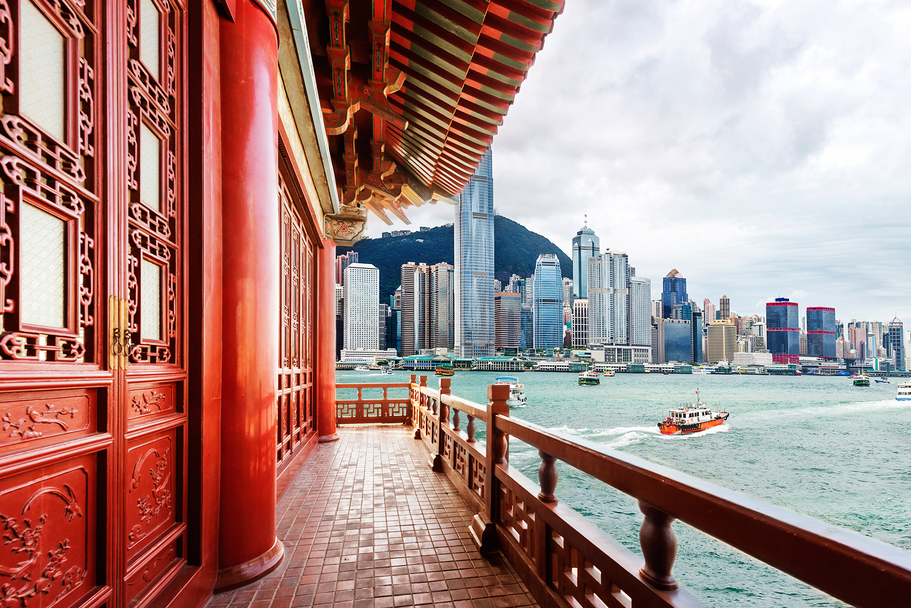 Hong_Kong_30Young woman traveler traveling into Hongkong beautiful golden teak wood pagoda at Nan Lian Garden in Hong Kong