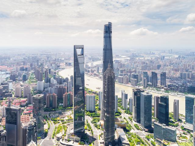 china_805Shanghai Skylines, Shanghai, China. Aerial view of Jin Mao Tower, Shanghai tower, Shanghai World Financial Center and Oriental Pearl Tower
