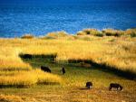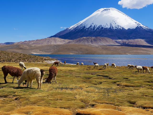 south_america_223Alpacas (Vicugna pacos) graze at the Chungara lake shore at 3200 meters above sea level with Parinacota volcano at the background in Lauca National park near Putre, Chile.