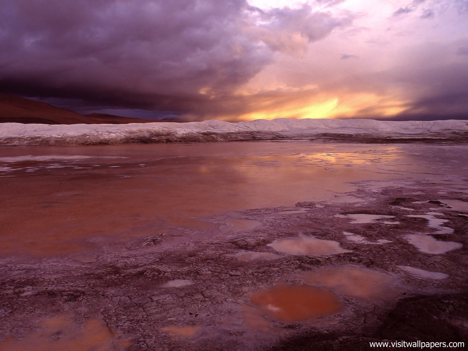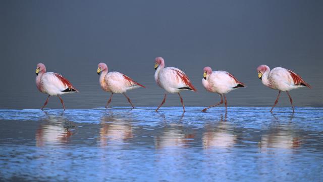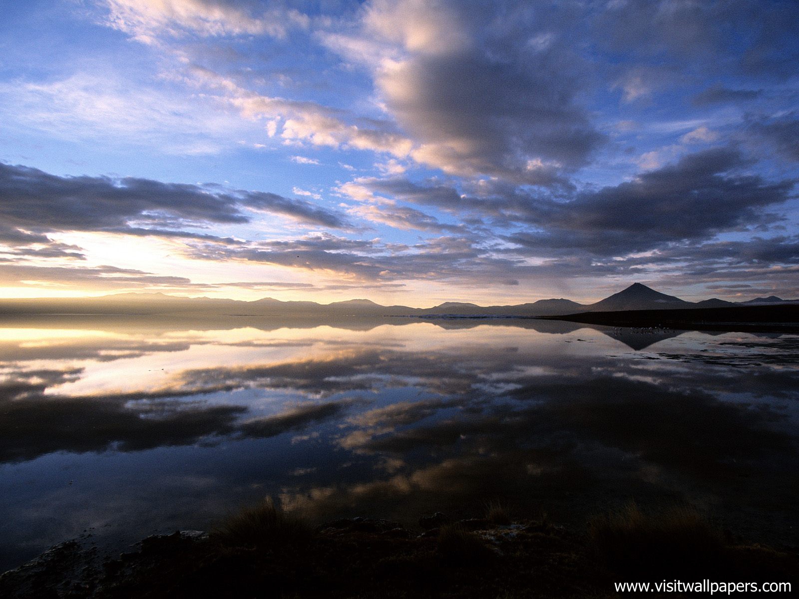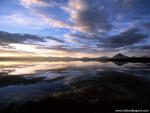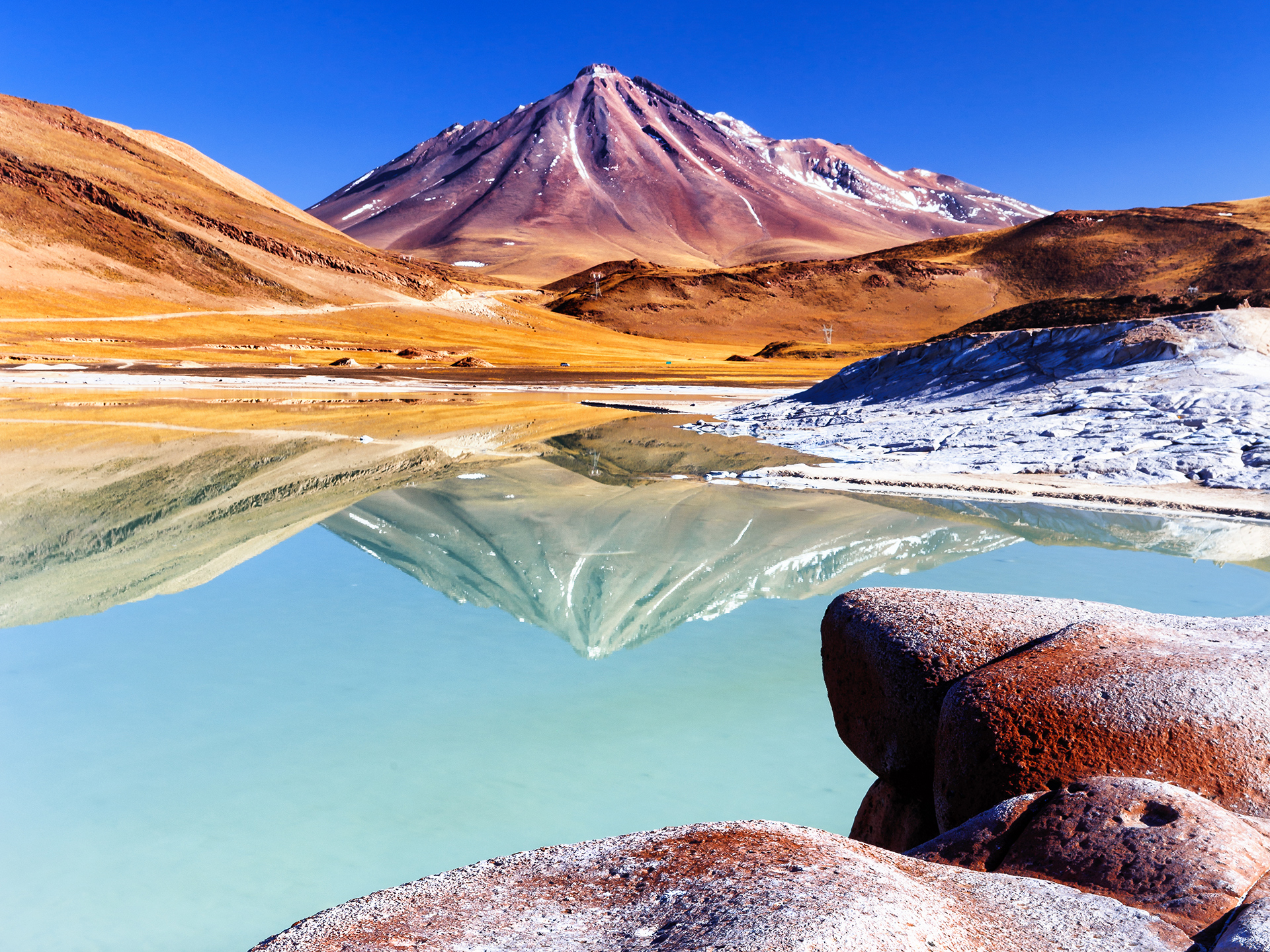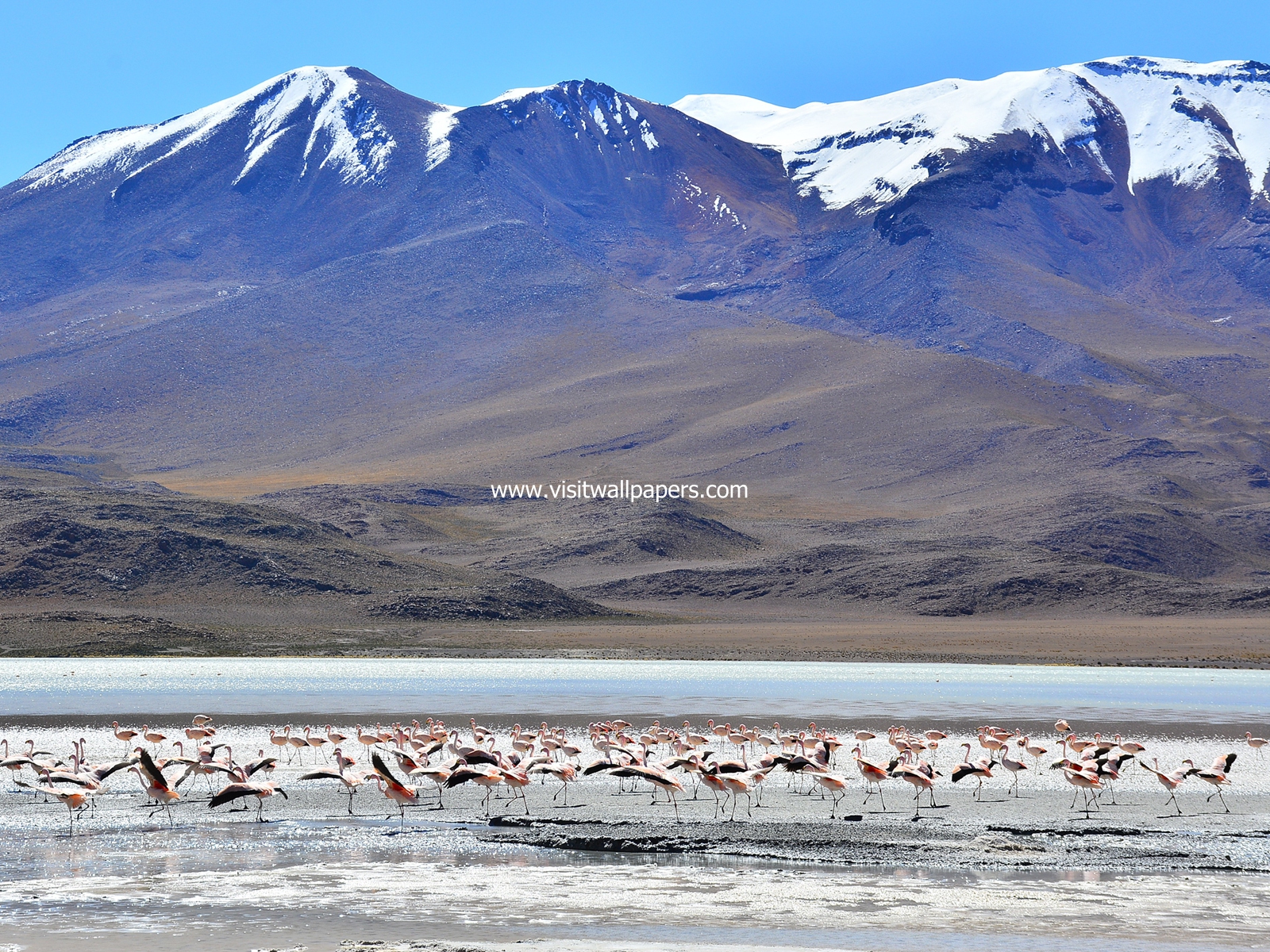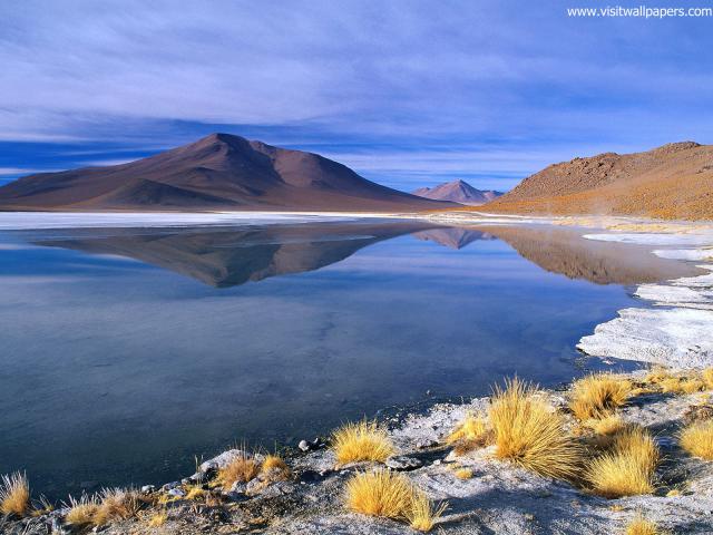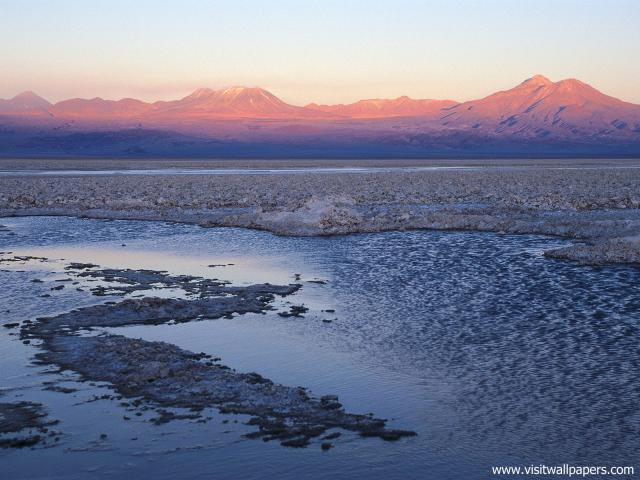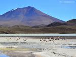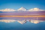 south_america_291Snowy Licancabur volcano in Andes montains reflecting in the wate of Laguna Chaxa with Andean flamingos, Atacama salar, Chile