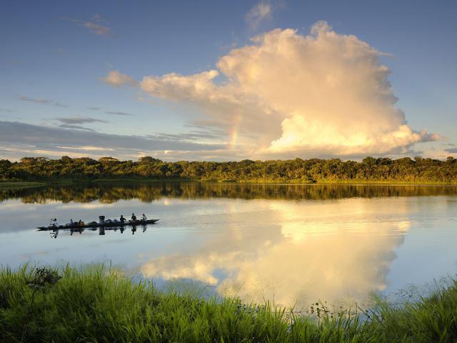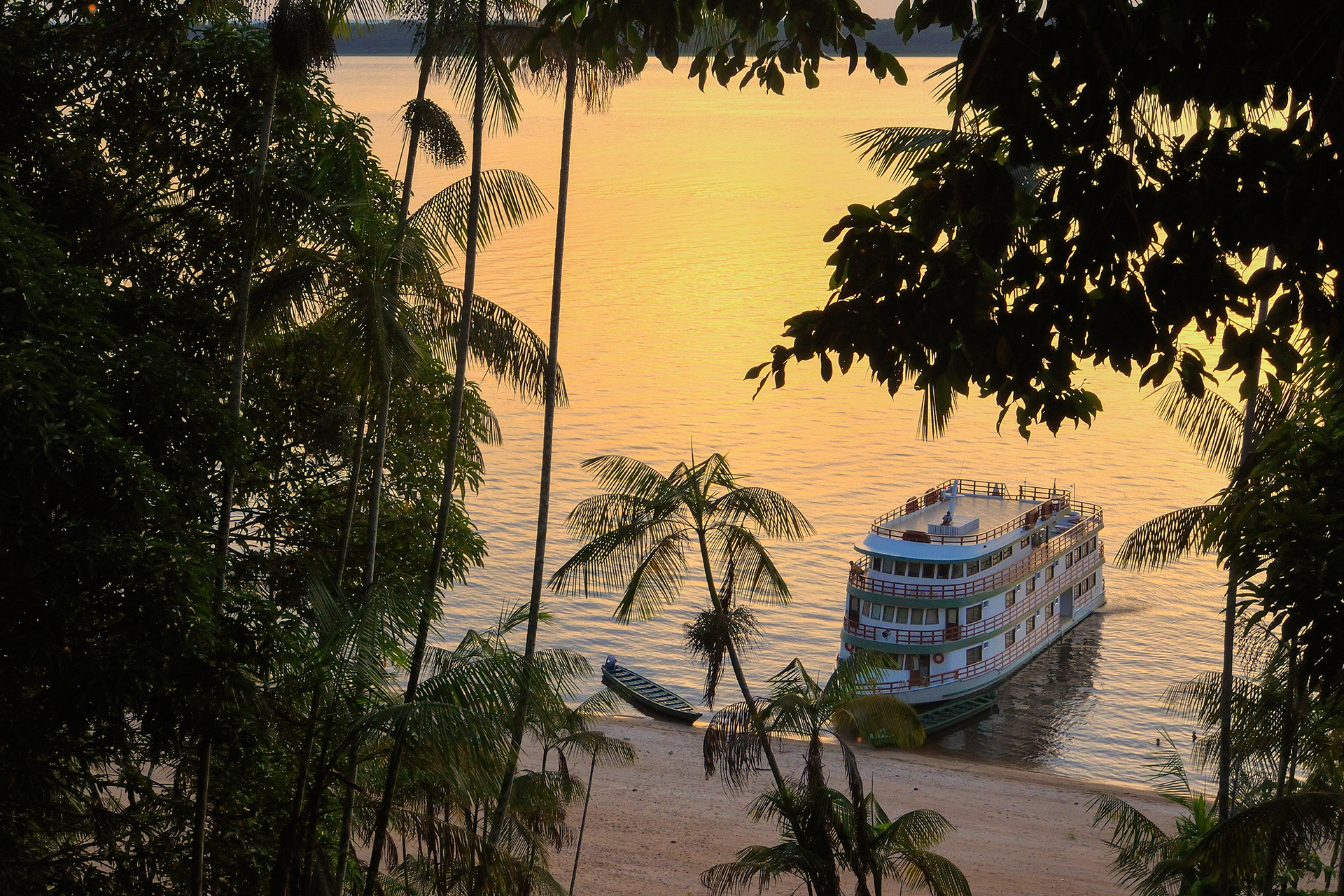 Boat in Amazon river at sunset
