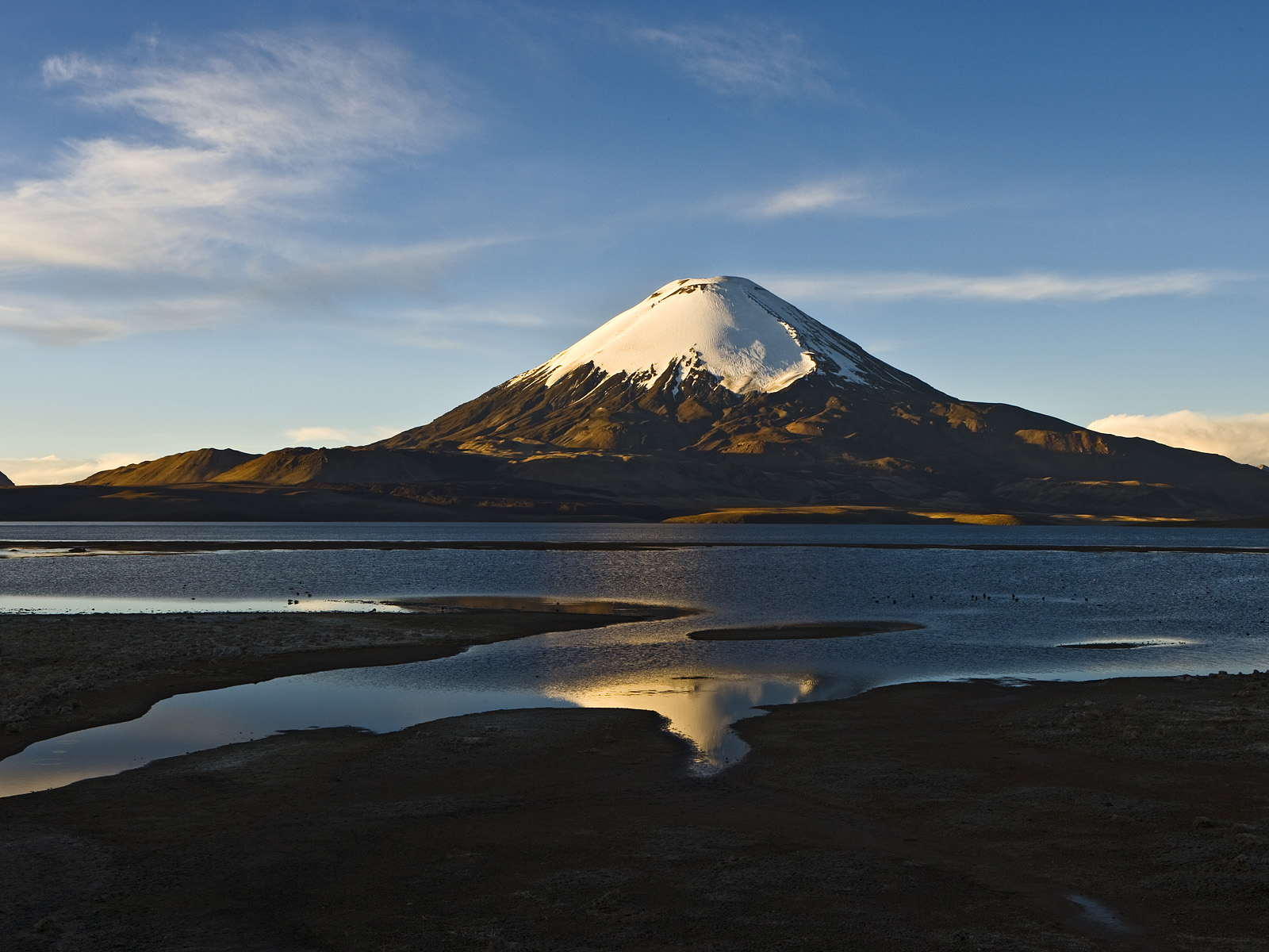 Snow capped Parinacota Volcano reflected in Lake Chungara, Chile
