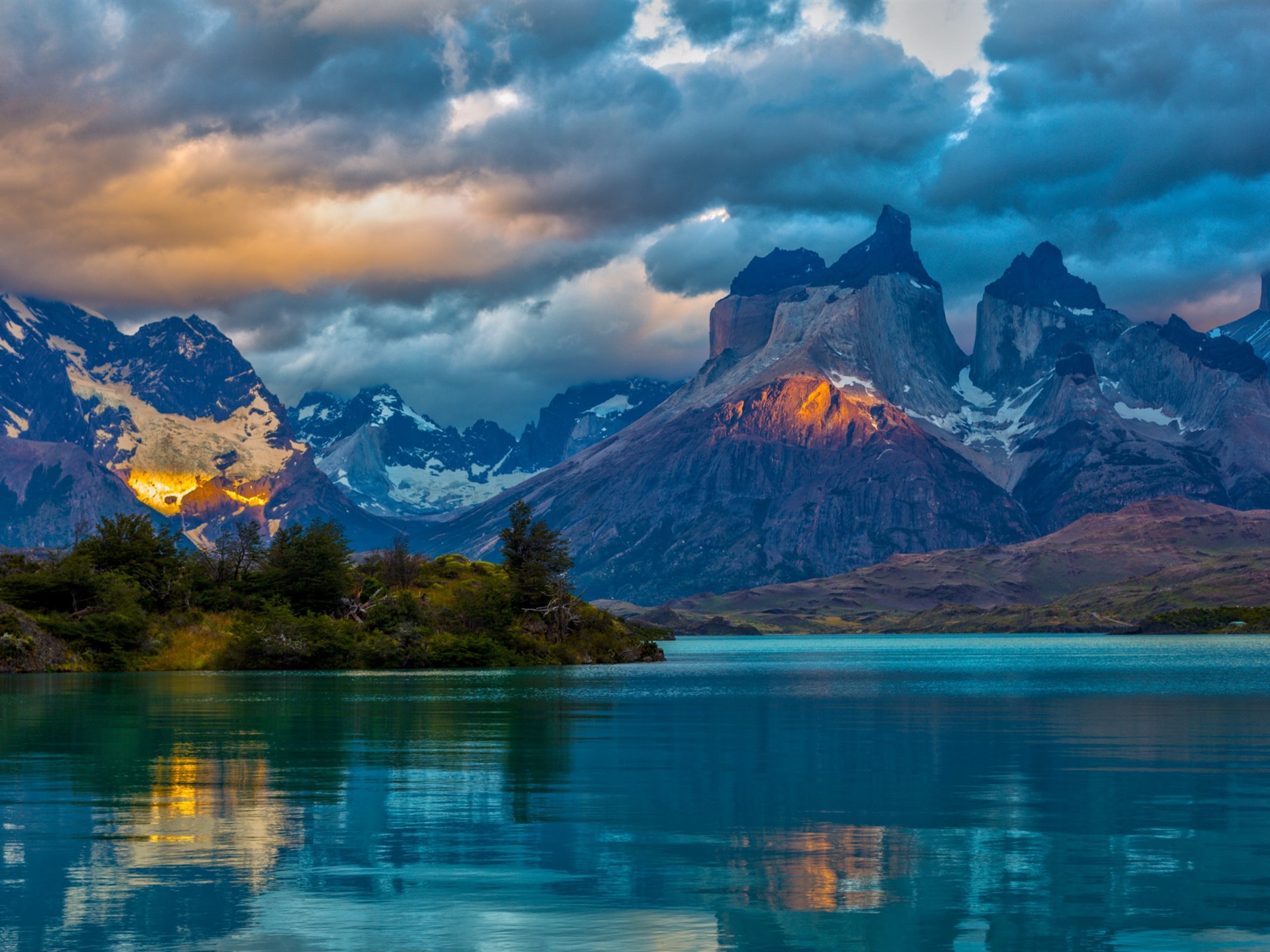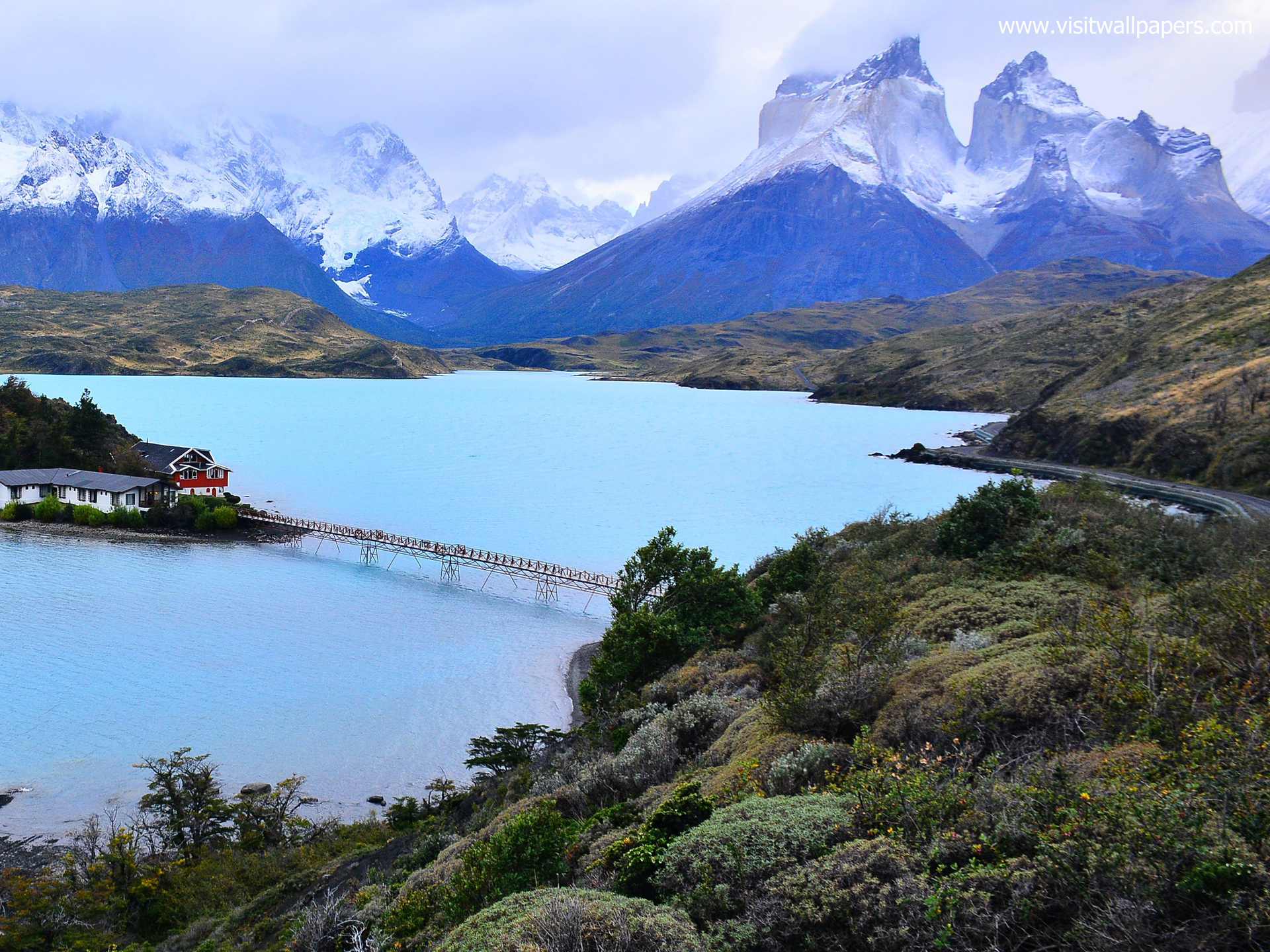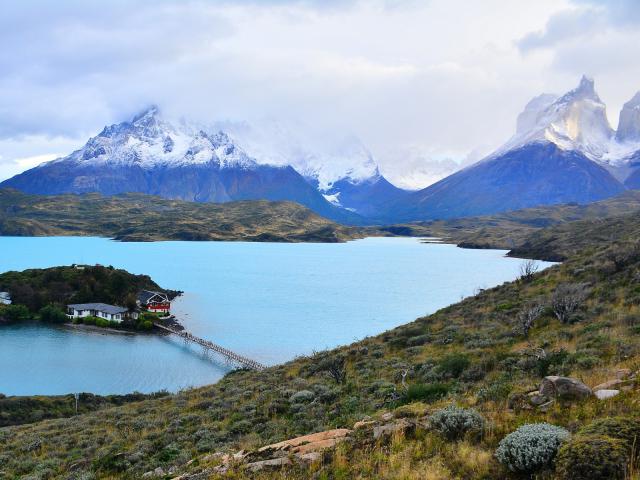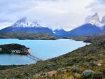 south_america_281National Park Torres del Paine, Chile. Azure Lake Pehoe at the foot of the magnificent snow-covered cliffs of Los Kuernos