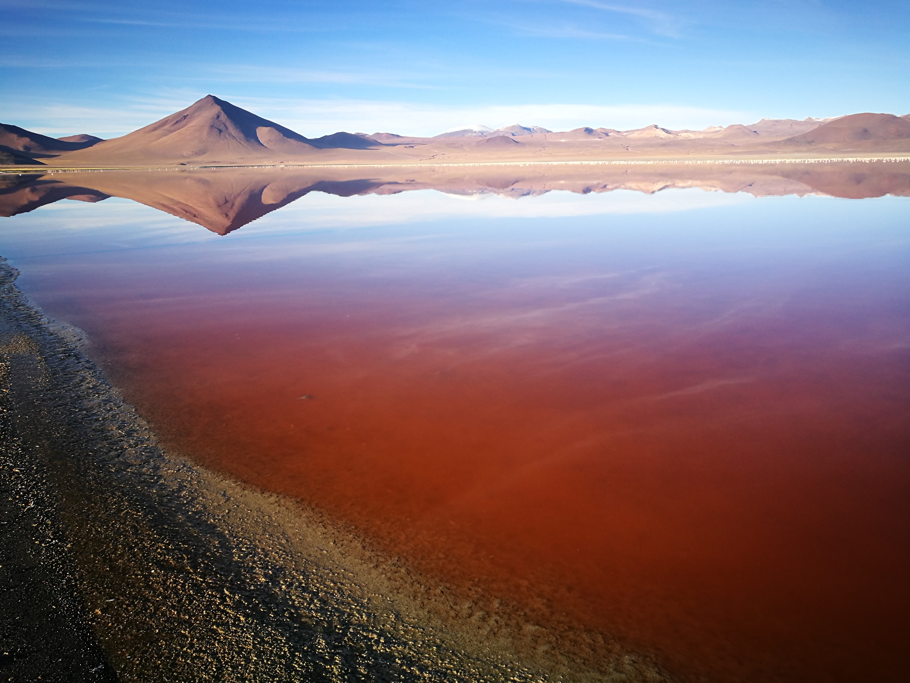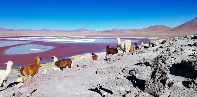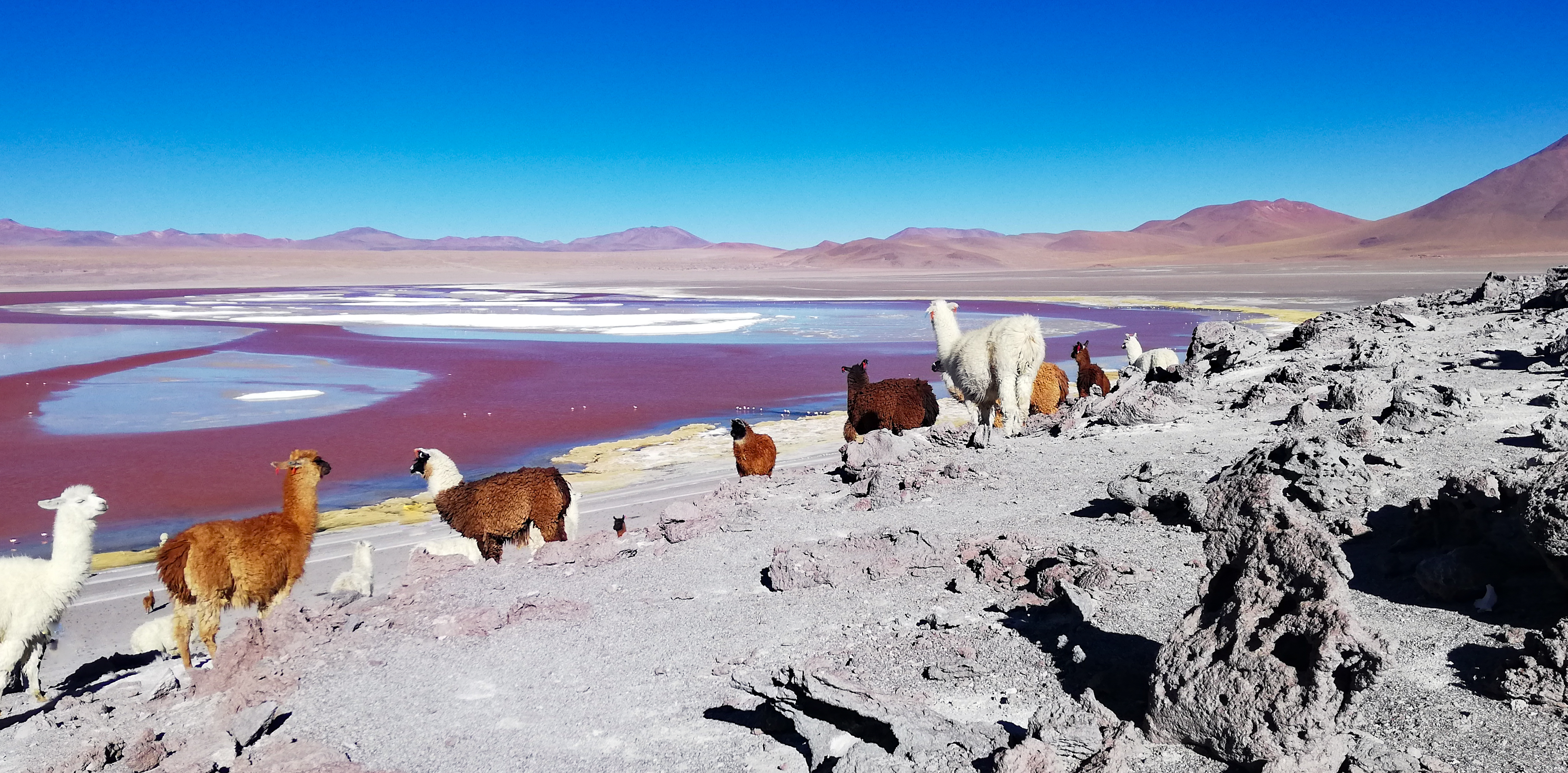 Spectacular panorama of Laguna Colorada (or Red lagoon) in Bolivia: a salt lake characterized by shallow waters rich in minerals and microorganisms, home to flamingos and llamas.