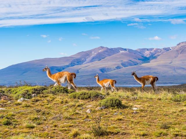Three guanacoes in Torres del Paine national park, Patagonia, Chile