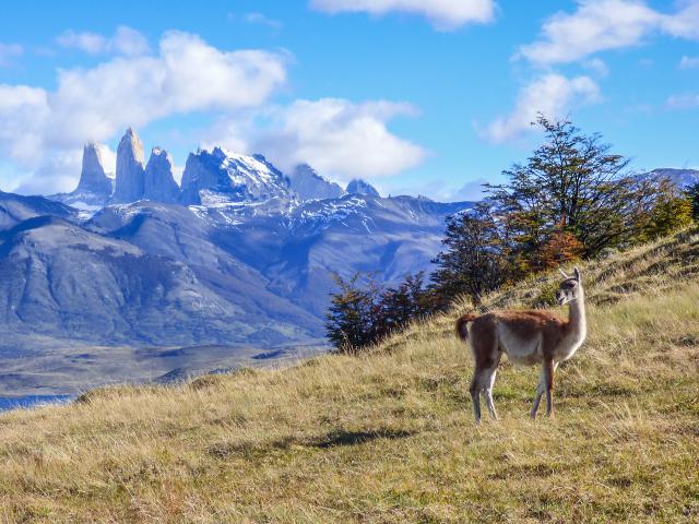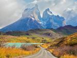 south_america_162Majestic peaks of Los Kuernos over Lake Pehoe. On a dirt road is worth guanaco - Llama. The national park Torres del Paine, Patagonia, Chile
