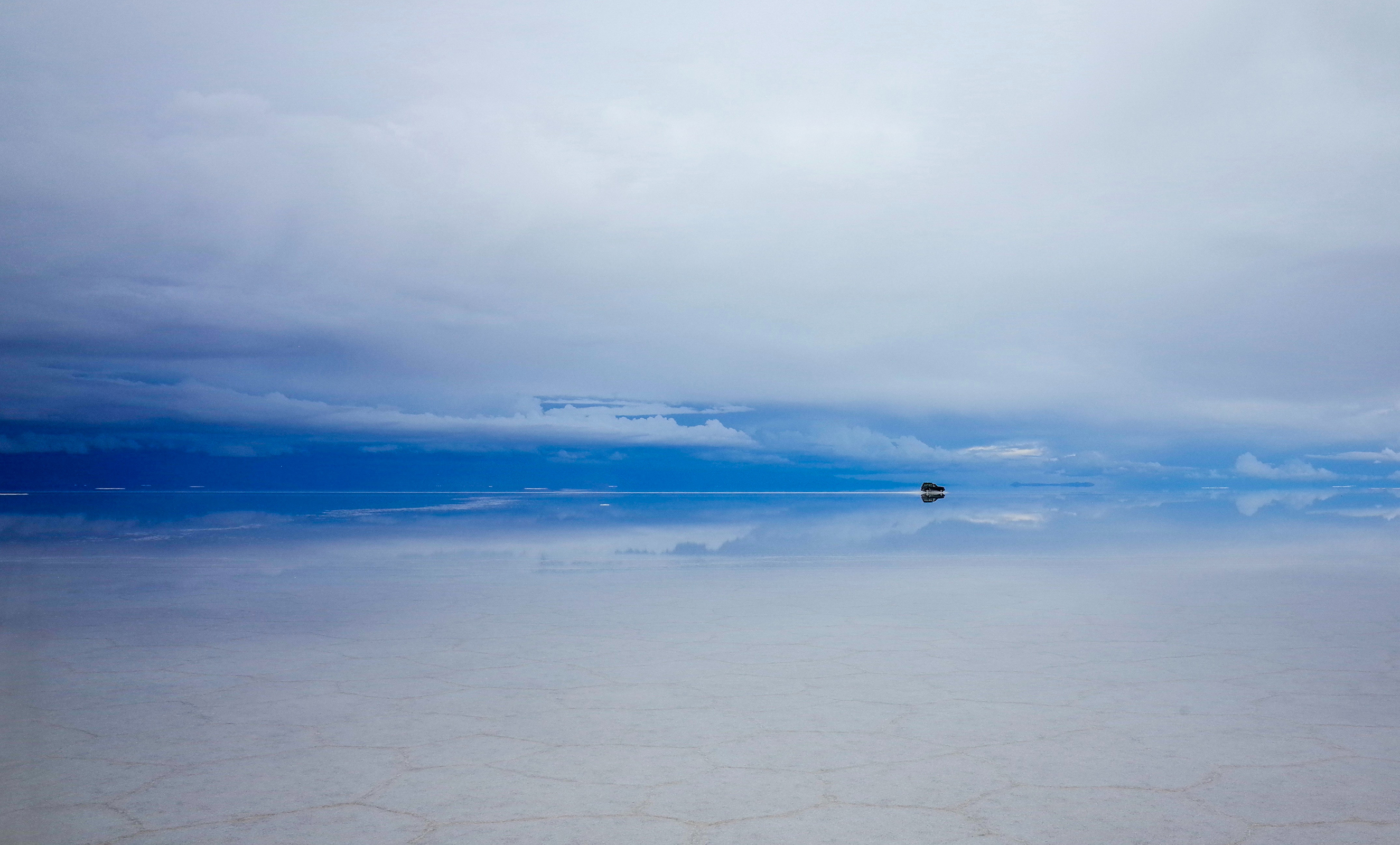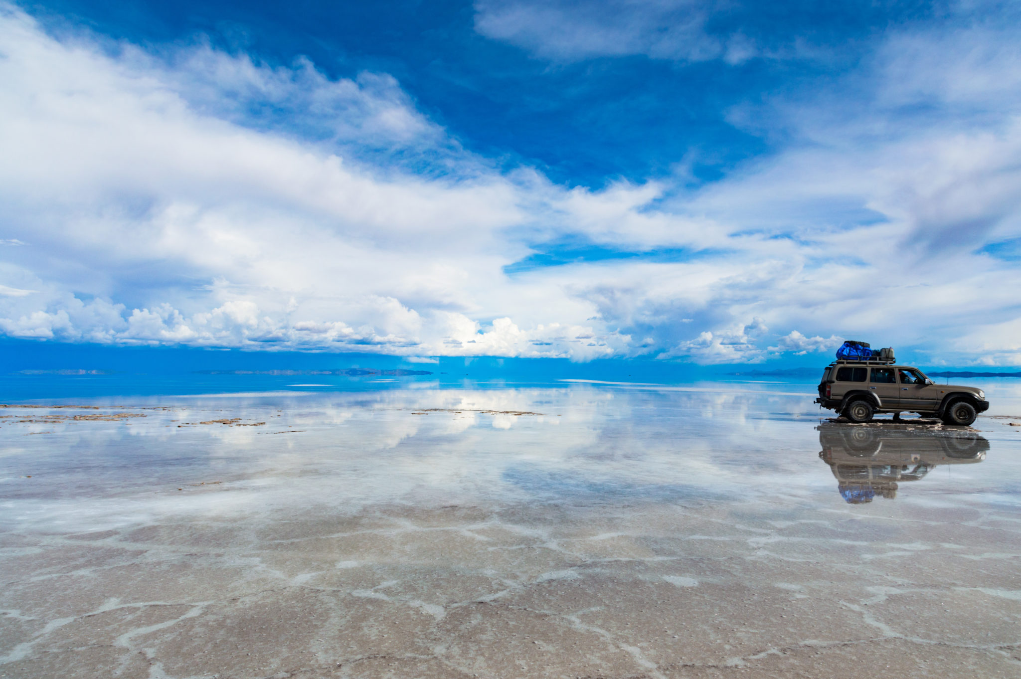 Jeep in the salt lake, Salar de Uyuni, Bolivia