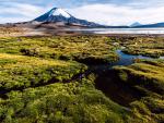 Alpacas (Vicugna pacos) graze at the Chungara lake shore at 3200 meters above sea level with Parinacota volcano at the background in Lauca National park near Putre, Chile.