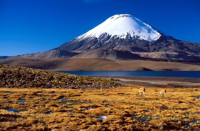 south_america_178Snow capped Parinacota Volcano reflected in Lake Chungara, Chile