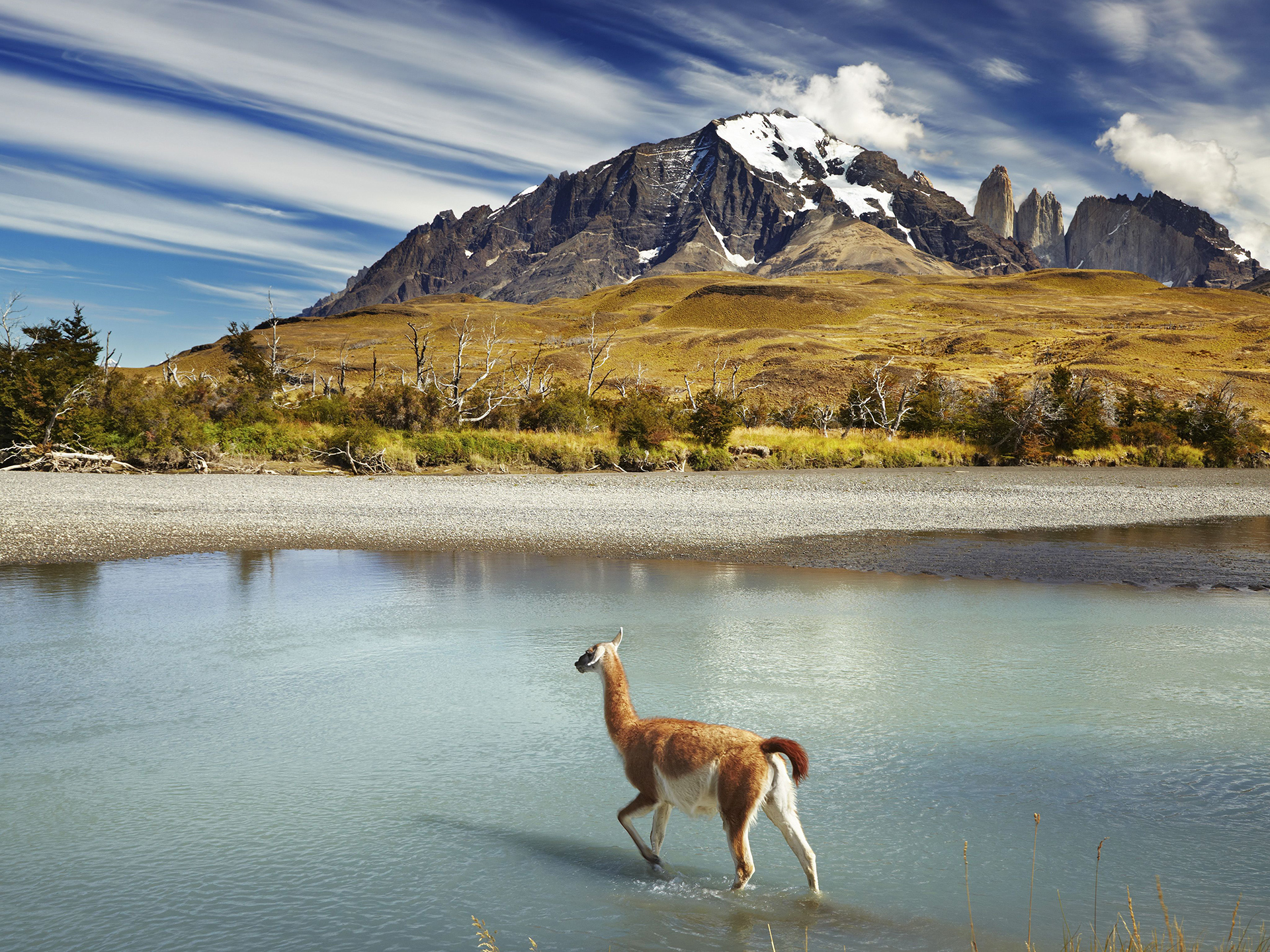 south_america_187Guanaco crossing the river in Torres del Paine National Park, Patagonia, Chile