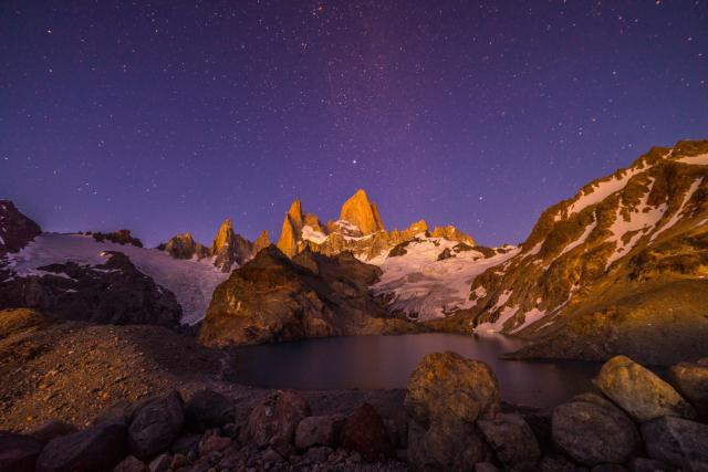 Mount Fitz Roy at night with stars, a massive mountain in the Patagonia region of Argentina. South America