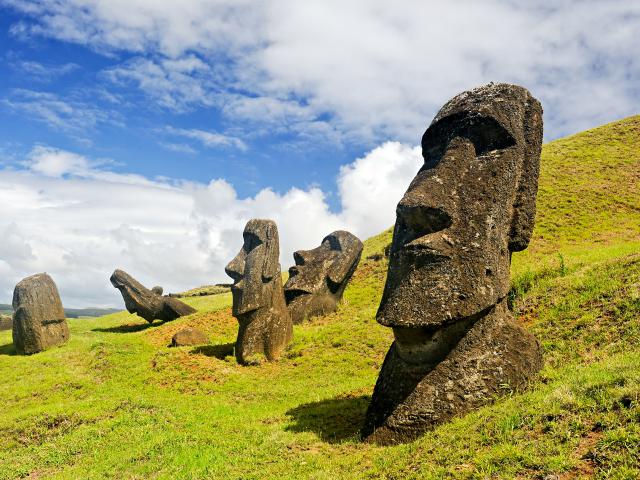 Moais in the Rapa Nui National Park on the slopes of the Rano Raruku volcano on Easter Island, Chile.
