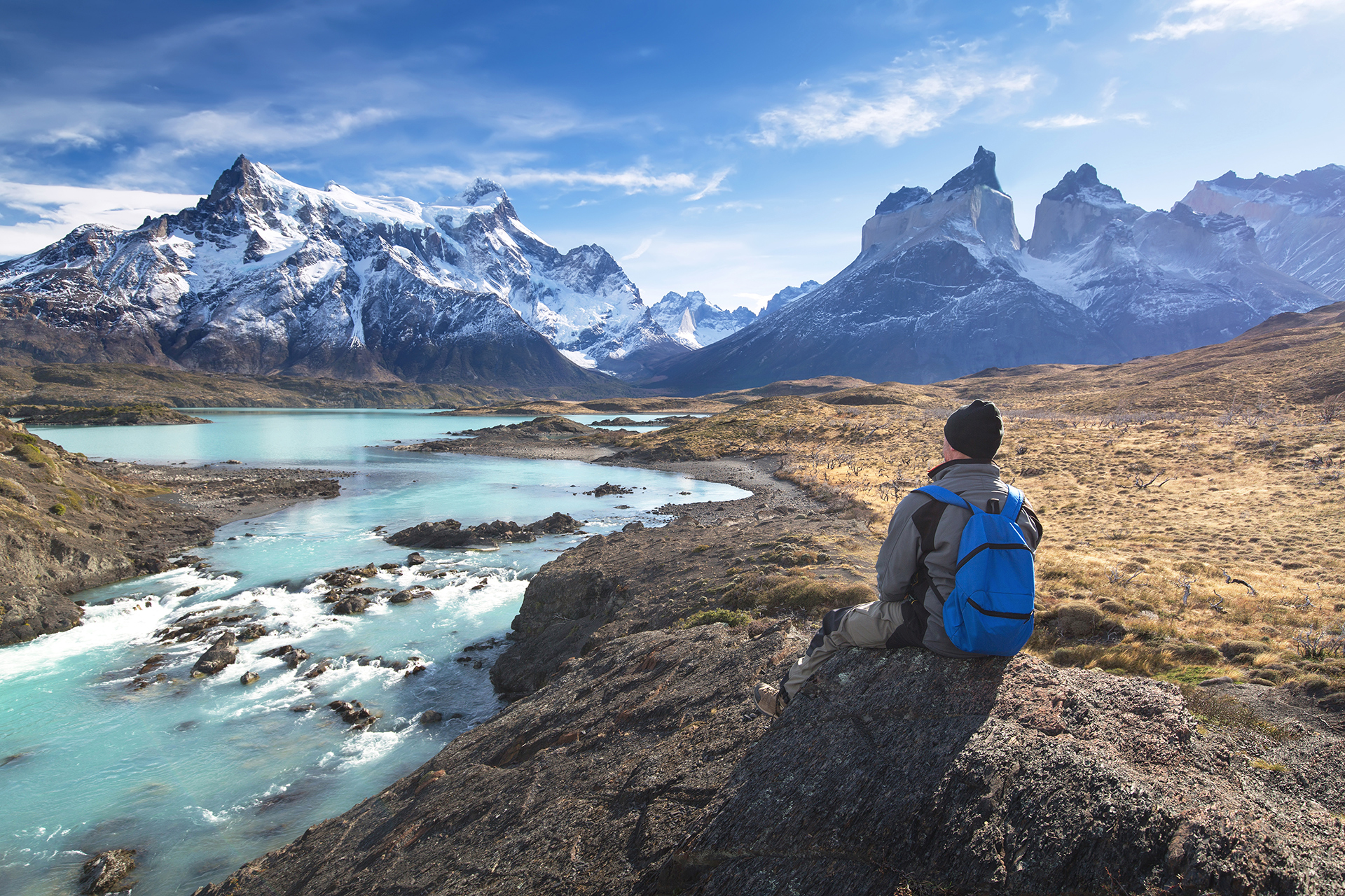 National Park Torres del Paine, Chile. Azure Lake Pehoe at the foot of the magnificent snow-covered cliffs of Los Kuernos