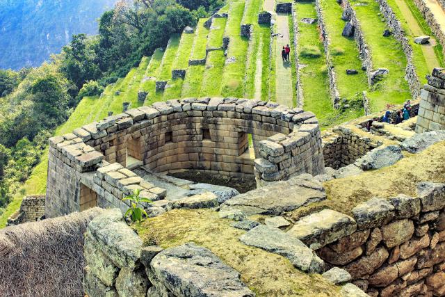 Temple of the sun in the ruins of the ancient city of Machu Picchu, Peru