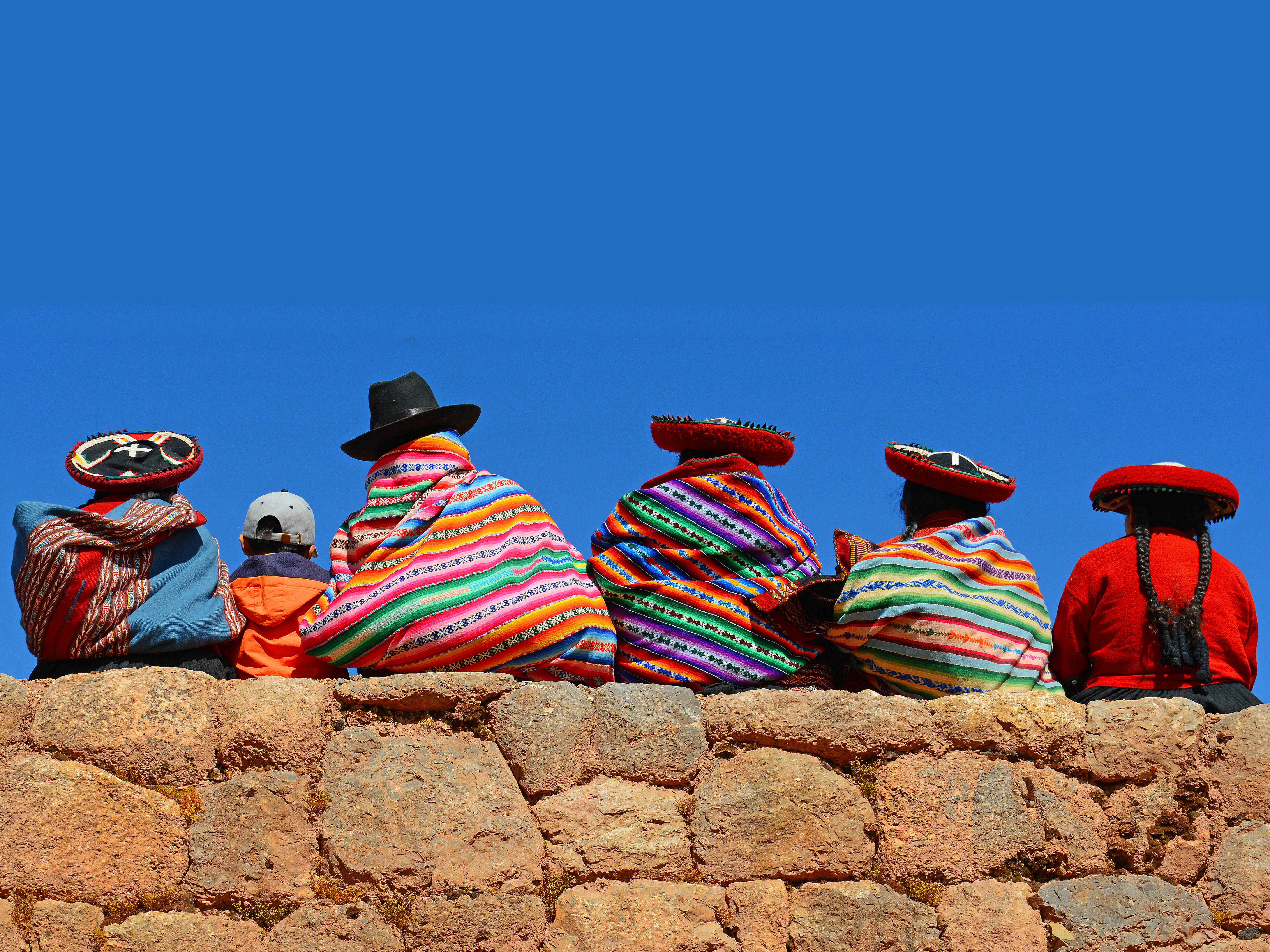 south_america_288A group of Quechua indigenous women in traditional clothing and a young boy sitting and chatting on an ancient Inca wall in the archaeological site of Chinchero in the region of Cusco city, Peru.