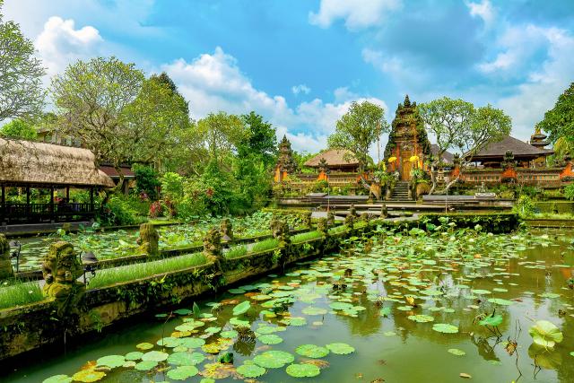 Lotus pond and Pura Saraswati temple in Ubud, Bali, Indonesia.