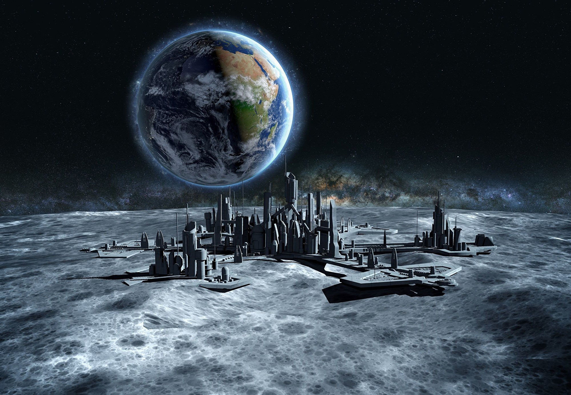 sci-fi_151Two Astronauts in Space Suits Stand on the Planet and Looking at the The Milky Way Galaxy. In the Background Lunar Base with Geodesic Dome. Moon Colonization and Space Travel Concept.